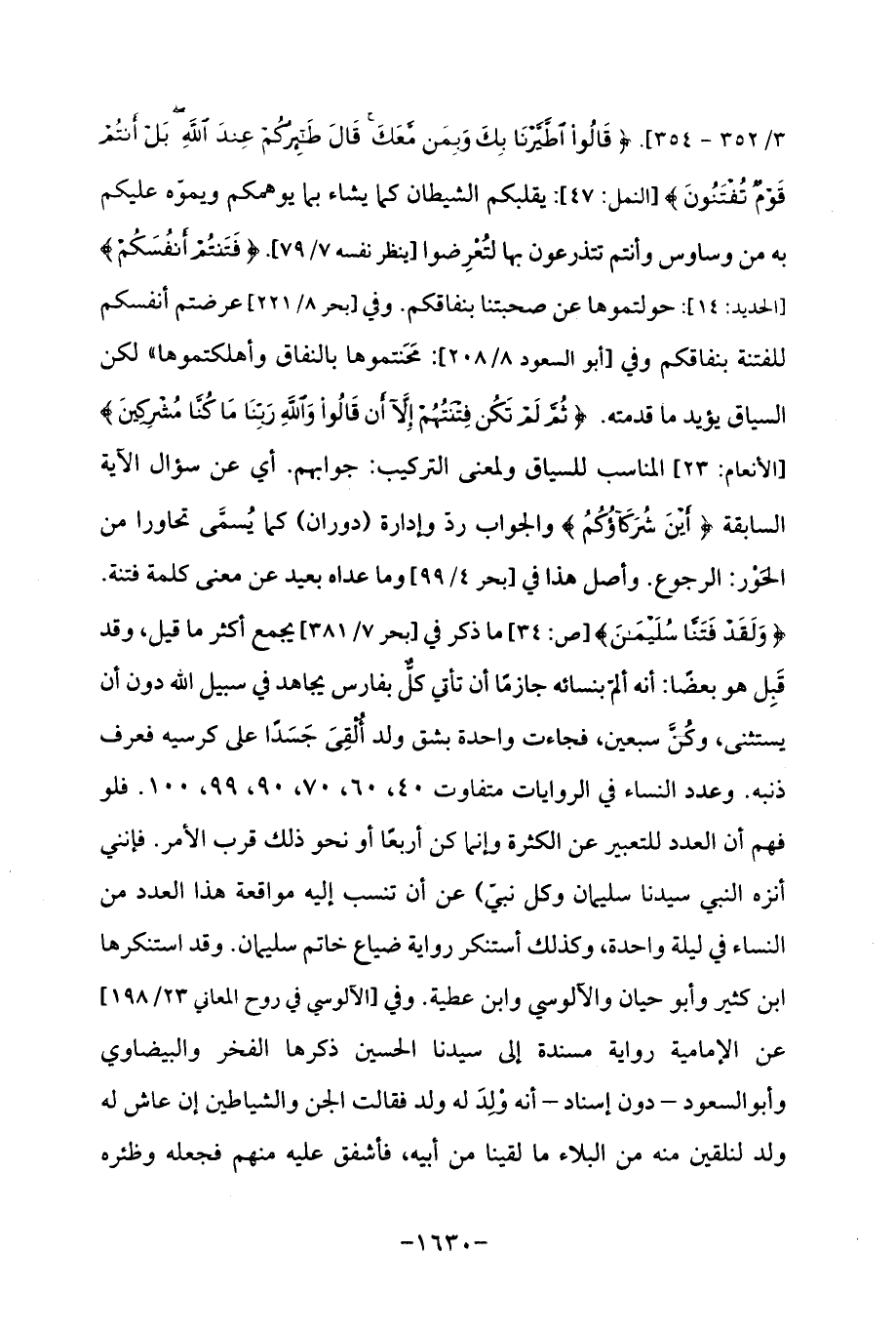 3/ 352 - 354]. {قَالُوا اطَّيَّرْنَا بِكَ وَبِمَنْ مَعَكَ قَالَ طَائِرُكُمْ عِنْدَ اللَّهِ بَلْ أَنْتُمْ قَوْمٌ تُفْتَنُونَ} [النمل: 47]: يقلبكم الشيطان كما يشاء بما يوهمكم ويموّه عليكم به من وساوس وأنتم تتذرعون بها لتُعْرِضوا [ينظر نفسه 7/ 79]. {فَتَنْتُمْ أَنْفُسَكُمْ} [الحديد: 14]: حولتموها عن صحبتنا بنفاقكم. وفي [بحر 8/ 221] عرضتم أنفسكم للفتنة بنفاقكم وفي [أبو السعود 8/ 208]: مَحَنتموها بالنفاق وأهلكتموها "لكن السياق يؤيد ما قدمته. {ثُمَّ لَمْ تَكُنْ فِتْنَتُهُمْ إِلَّا أَنْ قَالُوا وَاللَّهِ رَبِّنَا مَا كُنَّا مُشْرِكِينَ} [الأنعام: 23] المناسب للسياق ولمعنى التركيب: جوابهم. أي عن سؤال الآية السابقة {أَيْنَ شُرَكَاؤُكُمُ} والجواب ردّ وإدارة (دوران) كما يُسمَّى تحاورا من الحَوْر: الرجوع. وأصل هذا في [بحر 4/ 99] وما عداه بعيد عن معنى كلمة فتنة. {وَلَقَدْ فَتَنَّا سُلَيْمَانَ} [ص: 34] ما ذكر في [بحر 7/ 381] يجمع أكثر ما قيل، وقد قَبِل هو بعضًا: أنه ألمّ بنسائه جازمًا أن تأتي كلٌّ بفارس يجاهد في سبيل اللَّه دون أن يستثنى، وكُنَّ سبعين، فجاءت واحدة بشق ولد أُلْقِىَ جَسَدًا على كرسيه فعرف ذنبه. وعدد النساء في الروايات متفاوت 40، 60، 70، 90، 99، 100. فلو فهم أن العدد للتعبير عن الكثرة وإنما كن أربعًا أو نحو ذلك قرب الأمر. فإنني أنزه النبي سيدنا سليمان وكل نبيّ) عن أن تنسب إليه مواقعة هذا العدد من النساء في ليلة واحدة، وكذلك أستنكر رواية ضياع خاتم سليمان. وقد استنكرها ابن كثير وأبو حيان والآلوسي وابن عطية. وفي [الآلوسي في روح المعاني 23/ 198] عن الإمامية رواية مسندة إلى سيدنا الحسين ذكرها الفخر والبيضاوي وأبو السعود -دون إسناد- أنه وْلِدَ له ولد فقالت الجن والشياطين إن عاش له ولد لنلقين منه من البلاء ما لقينا من أبيه، فأشفق عليه منهم فجعله وظئره