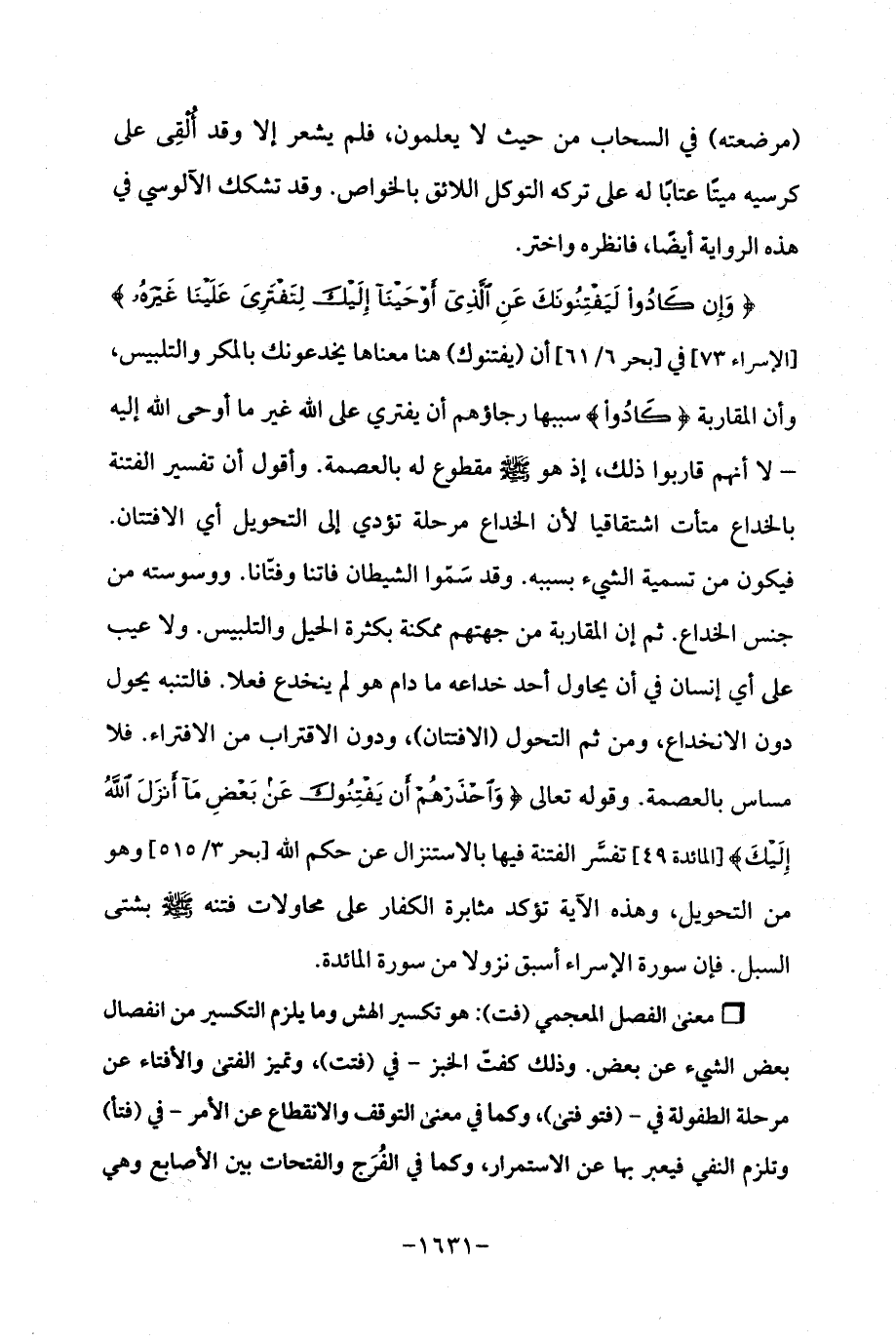 {وَإِنْ كَادُوا لَيَفْتِنُونَكَ عَنِ الَّذِي أَوْحَيْنَا إِلَيْكَ لِتَفْتَرِيَ عَلَيْنَا غَيْرَهُ} [الإسراء 73] في [بحر 6/ 61] أن (يفتنوك) هنا معناها يخدعونك بالمكر والتلبيس، وأن المقاربة {كَادُوا} سببها رجاؤهم أن يفتري على اللَّه غير ما أوحى اللَّه إليه -لا أنهم قاربوا ذلك، إذ هو -صلى اللَّه عليه وسلم- مقطوع له بالعصمة. وأقول أن تفسير الفتنة بالخداع متأت اشتقاقيا لأن الخداع مرحلة تؤدي إلى التحويل أي الافتتان. فيكون من تسمية الشيء بسببه. وقد سَمّوا الشيطان فاتنا وفتّانا. ووسوسته من جنس الخداع. ثم إن المقاربة من جهتهم ممكنة بكثرة الحيل والتلبيس. ولا عيب على أي إنسان في أن يحاول أحد خداعه ما دام هو لم ينخدع فعلا. فالتنبه يحول دون الانخداع، ومن ثم التحول (الافتتان)، ودون الاقتراب من الافتراء. فلا مساس بالعصمة. وقوله تعالى {وَاحْذَرْهُمْ أَنْ يَفْتِنُوكَ عَنْ بَعْضِ مَا أَنْزَلَ اللَّهُ إِلَيْكَ} [المائدة 49] تفسَّر الفتنة فيها بالاستنزال عن حكم اللَّه [بحر 3/ 515] وهو من التحويل، وهذه الآية تؤكد مثابرة الكفار على محاولات فتنه -صلى اللَّه عليه وسلم- بشتى السبل. فإن سورة الإسراء أسبق نزولا من سورة المائدة.
