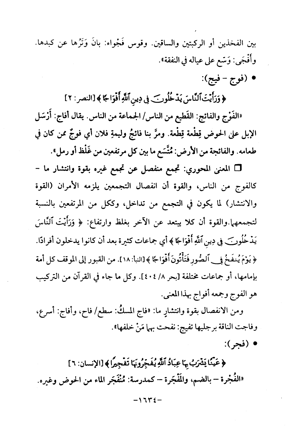 Qتجمع منفصل عن تجمع غيره بقوة وانتشار ما - كالفوج من الناس، والقوة أن انفصال التجمعين يلزمه الأمران (القوة والانتشار) لما يكون في التجمع من تداخل، وككل من المرتفعين بالنسبة لتجمعهما. والقوة أن كلا يبتعد عن الآخر بغلظ وارتفاع: {وَرَأَيْتَ النَّاسَ يَدْخُلُونَ فِي دِينِ اللَّهِ أَفْوَاجًا} أي جماعات كثيرة بعد أن كانوا يدخلون أفرادًا. {يَوْمَ يُنْفَخُ فِي الصُّورِ فَتَأْتُونَ أَفْوَاجًا} [النبأ: 18]. من القبور إلى الموقف كل أمة بإمامها، أو جماعات مختلفة [بحر 8/ 404]. وكل ما جاء في القرآن من التركيب هو الفوج وجمعه أفواج بهذا المعنى.