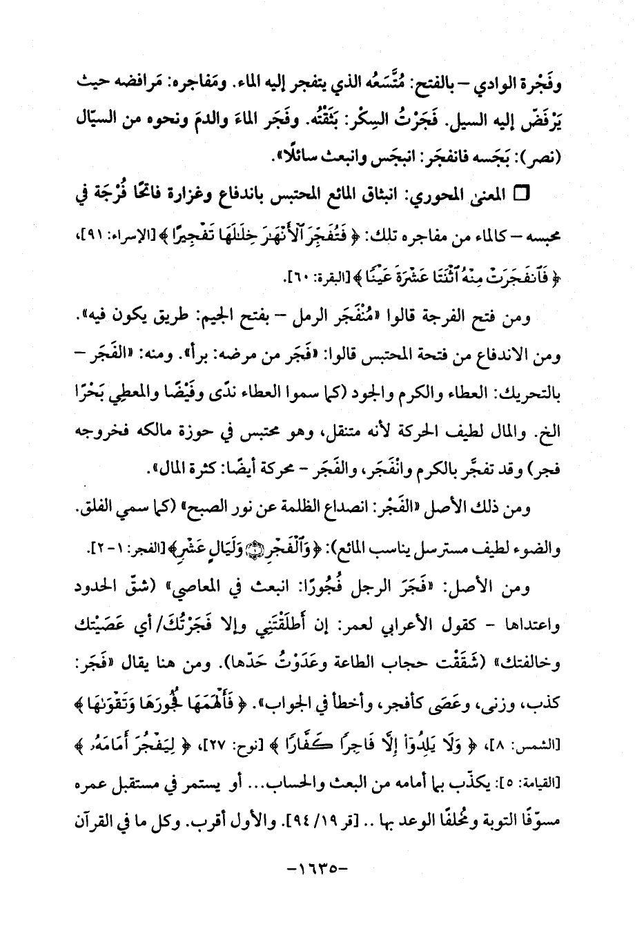ومن الأصل: "فَجَرَ الرجل فُجُورًا: انبعث في المعاصي " (شقّ الحدود واعتداها - كقول الأعرابي لعمر: إن أَطلَقْتَنِي وإلا فَجَرْتُكَ/ أي عَصَيْتك وخالفتك " (شَقَقْت حجاب الطاعة وعَدَوْتُ حَدّها). ومن هنا يقال "فَجَر: كذب، وزنى، وعَصَى كأفجر، وأخطأ في الجواب ". {فَأَلْهَمَهَا فُجُورَهَا وَتَقْوَاهَا} [الشمس: 8]، {وَلَا يَلِدُوا إِلَّا فَاجِرًا كَفَّارًا} [نوح: 27]، {لِيَفْجُرَ أَمَامَهُ} [القيامة: 5]: يكذّب بما أمامه من البعث والحساب. . . أو يستمر في مستقبل عمره مسوّفًا التوبة ومُخلفًا الوعد بها. . [قر 19/ 94]. والأول أقرب. وكل ما في القرآن