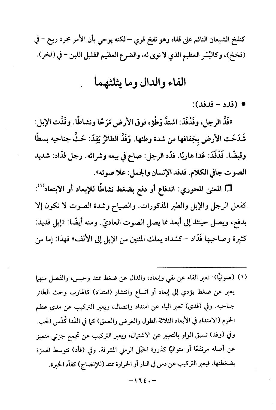 (¬1) (صوتيًّا): تعبر الفاء عن نفي وإبعاد، والدال عن ضغط ممتد وحبس، والفصل منهما يعبر عن ضغط يؤدي إلى إبعاد أو اتساع وانتشار (امتداد) كالهارب وحث الطائر جناحيه. وفي (فدى) تعبر الياء عن امتداد واتصال، ويعبر التركيب عن مدى عظم الجرم (الامتداد في الأبعاد الثلاثة الطول والعرض والعمق) كما في الفَدا كُدْس الحب. وفي (وفد) تسبق الواو بالتعبير عن الاشتمال، ويعبر التركيب عن تجمع جزئي متميز عن أصله مرتفعًا أو متواليًا كذروة الحَبْل الرملي المشرفة. وفي (فأد) تتوسط الهمزة بضغطتها، فيعبر التركيب عن دس في النار أو الحرارة ممتد (للإنضاج) كفأد الخبرة.