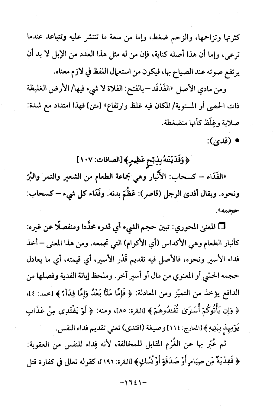 Qتبين حجم الشيء أي قدره محدَّدا ومنفصلًا عن غيره: كأنبار الطعام وهي الأكداس (أي الأكوام) التي تجمعه. ومن هذا المعنى - أخذ فداء الأسير ونحوه، فالأصل فيه تقديم قَدْر الأسير، أي قيمته، أي ما يعادل حجمه الحسّي أو المعنوي من مال أو أسير آخر. وملحظ إبانة الفدية وفصلها من الدافع يؤخذ من التميّز ومن المعادلة: {فَإِمَّا مَنًّا بَعْدُ وَإِمَّا فِدَاءً} [محمد: 4]، {وَإِنْ يَأْتُوكُمْ أُسَارَى تُفَادُوهُمْ} [البقرة: 85]، ومنه: {لَوْ يَفْتَدِي مِنْ عَذَابِ يَوْمِئِذٍ بِبَنِيهِ} [المعارج: 114] وصيغة (افتدى) تعني تقديم فداء النفس.