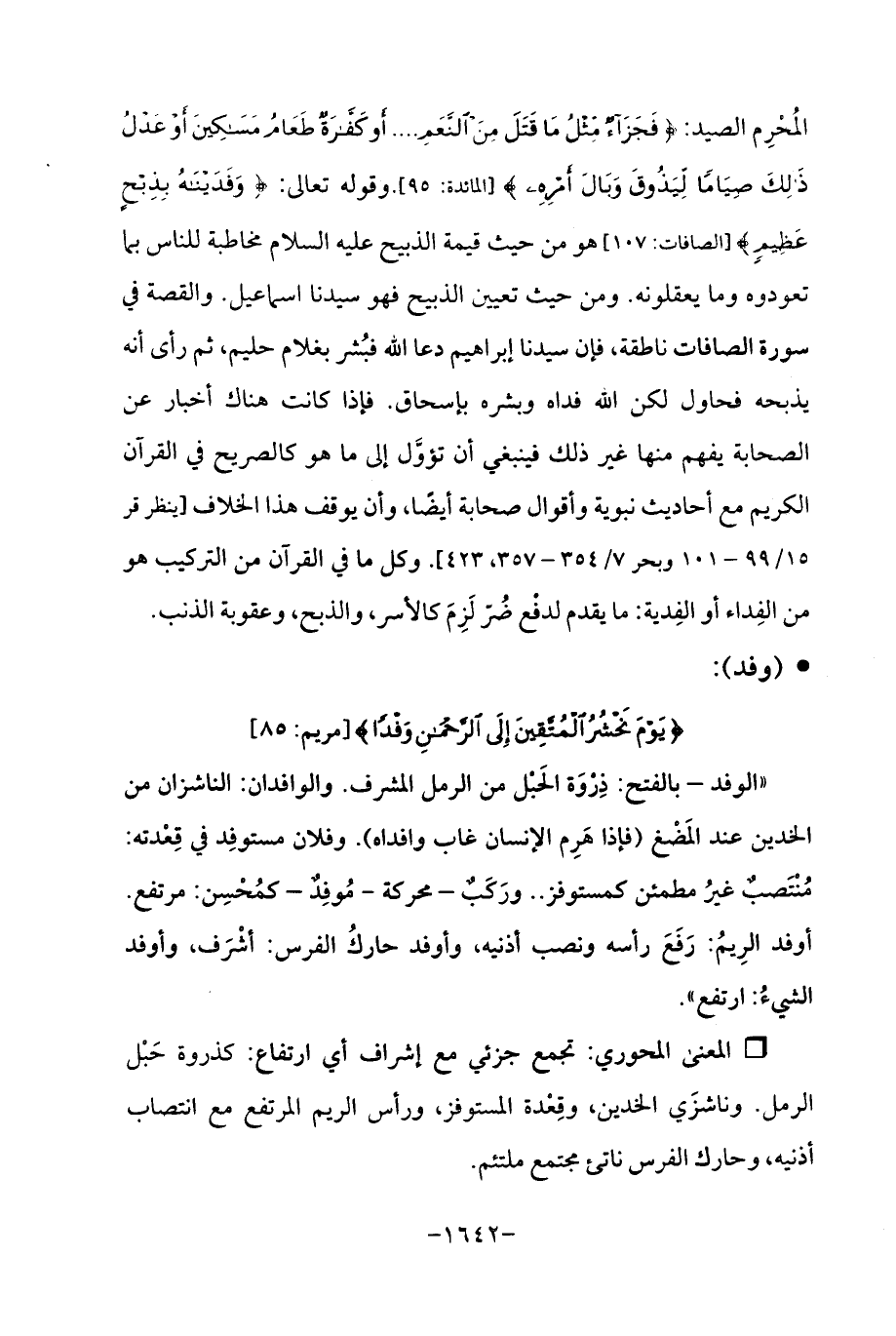 المُحْرِم الصيد: {فَجَزَاءٌ مِثْلُ مَا قَتَلَ مِنَ النَّعَمِ. . . أَوْ كَفَّارَةٌ طَعَامُ مَسَاكِينَ أَوْ عَدْلُ ذَلِكَ صِيَامًا لِيَذُوقَ وَبَالَ أَمْرِهِ} [المائدة 95]. وقوله تعالى: {وَفَدَيْنَاهُ بِذِبْحٍ عَظِيمٍ} [الصافات: 107] هو من حيث قيمة الذبيح عليه السلام مخاطبة للناس بما تعودوه وما يعقلونه. ومن حيث تعيين الذبيح فهو سيدنا إسماعيل. والقصة في سورة الصافات ناطقة، فإن سيدنا إبراهيم دعا اللَّه فبُشر بغلام حليم، ثم رأى أنه يذبحه فحاول لكن اللَّه فداه وبشره بإسحاق. فإذا كانت هناك أخبار عن الصحابة يفهم منها غير ذلك فينبغي أن تؤوَّل إلى ما هو كالصريح في القرآن الكريم مع أحاديث نبوية وأقوال صحابة أيضًا، وأن يوقف هذا الخلاف [ينظر قر 15/ 99 - 101 وبحر 7/ 354 - 357، 423]. وكل ما في القرآن من التركيب هو من الفِداء أو الفِدية: ما يقدم لدفْع ضُرّ لَزِمَ كالأسر، والذبح، وعقوبة الذنب.