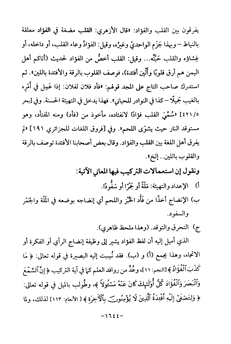 الذي أميل إليه أن لفظ الفؤاد يشير إلى وظيفة إنضاج الرأي أو الفكرة أو الاتجاه، وهذا يجمع (أ) و (ب). فقد نُسِبت إليه البصيرة في قوله تعالى: {مَا كَذَبَ الْفُؤَادُ مَا رَأَى} [النجم: 11]، وعُدَّ من روافد العلم كما في آية التركيب {إِنَّ السَّمْعَ وَالْبَصَرَ وَالْفُؤَادَ كُلُّ أُولَئِكَ كَانَ عَنْهُ مَسْئُولًا}، وطُولب بالميل في قوله تعالى: {وَلِتَصْغَى إِلَيْهِ أَفْئِدَةُ الَّذِينَ لَا يُؤْمِنُونَ بِالْآخِرَةِ} [الأنعام: 113] لذلك, ولما