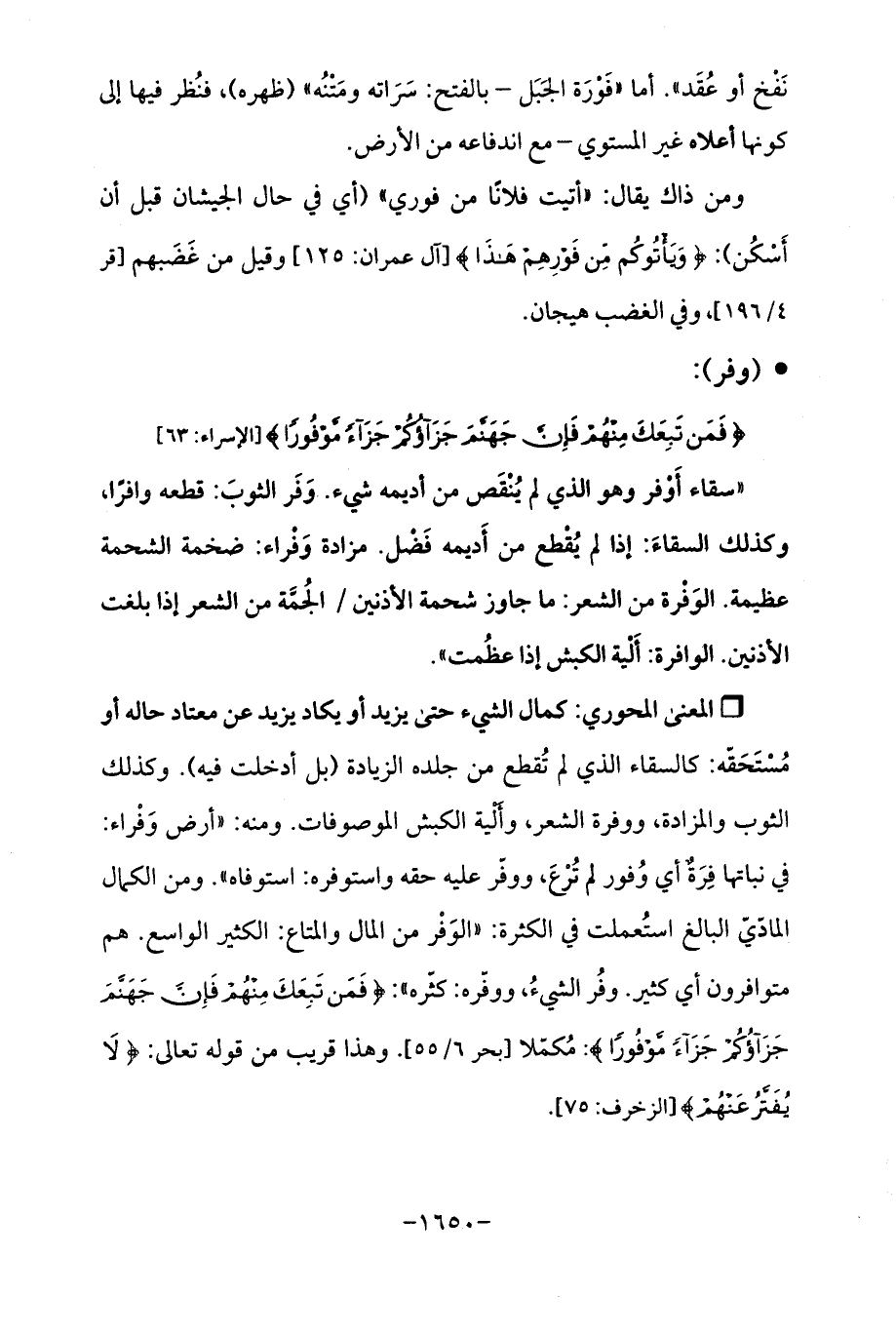 Qكمال الشيء حتى يزيد أو يكاد يزيد عن معتاد حاله أو مُسْتَحَقّه: كالسقاء الذي لم تُقطع من جلده الزيادة (بل أدخلت فيه). وكذلك الثوب والمزادة، ووفرة الشعر، وأَلْية الكبش الموصوفات. ومنه: "أرض وَفْراء: في نباتها فِرَةٌ أي وُفور لم تُرْعَ، ووفّر عليه حقه واستوفره: استوفاه ". ومن الكمال المادّيّ البالغ استُعملت في الكثرة: "الوَفْر من المال والمتاع: الكثير الواسع. هم متوافرون أي كثير. وفُر الشيءُ, ووفّره: كثّره ": {فَمَنْ تَبِعَكَ مِنْهُمْ فَإِنَّ جَهَنَّمَ جَزَاؤُكُمْ جَزَاءً مَوْفُورًا}: مُكمّلًا [بحر 6/ 55]. وهذا قريب من قوله تعالى: {لَا يُفَتَّرُ عَنْهُمْ} [الزخرف: 75].