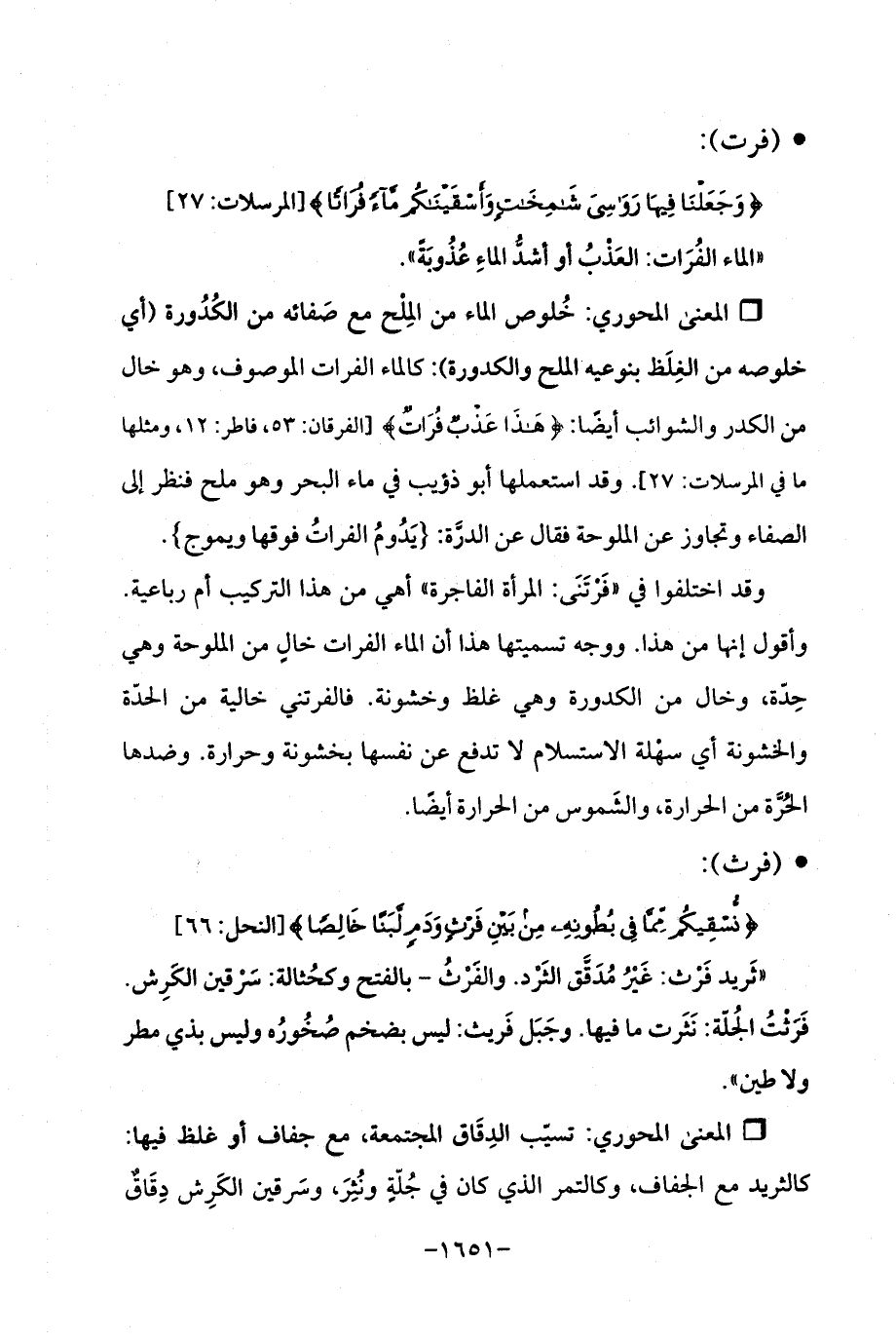 Qخُلوص الماء من المِلْح مع صَفائه من الكُدُورة (أي خلوصه من الغِلَظ بنوعيه الملح والكدورة): كالماء الفرات الموصوف، وهو خال من الكدر والشوائب أيضًا: {هَذَا عَذْبٌ فُرَاتٌ} [الفرقان: 53، فاطر: 12، ومثلها ما في المرسلات: 27]. وقد استعملها أبو ذؤيب في ماء البحر وهو ملح فنظر إلى الصفاء وتجاوز عن الملوحة فقال عن الدرَّة: {يَدُومُ الفراتُ فوقها ويموج}.