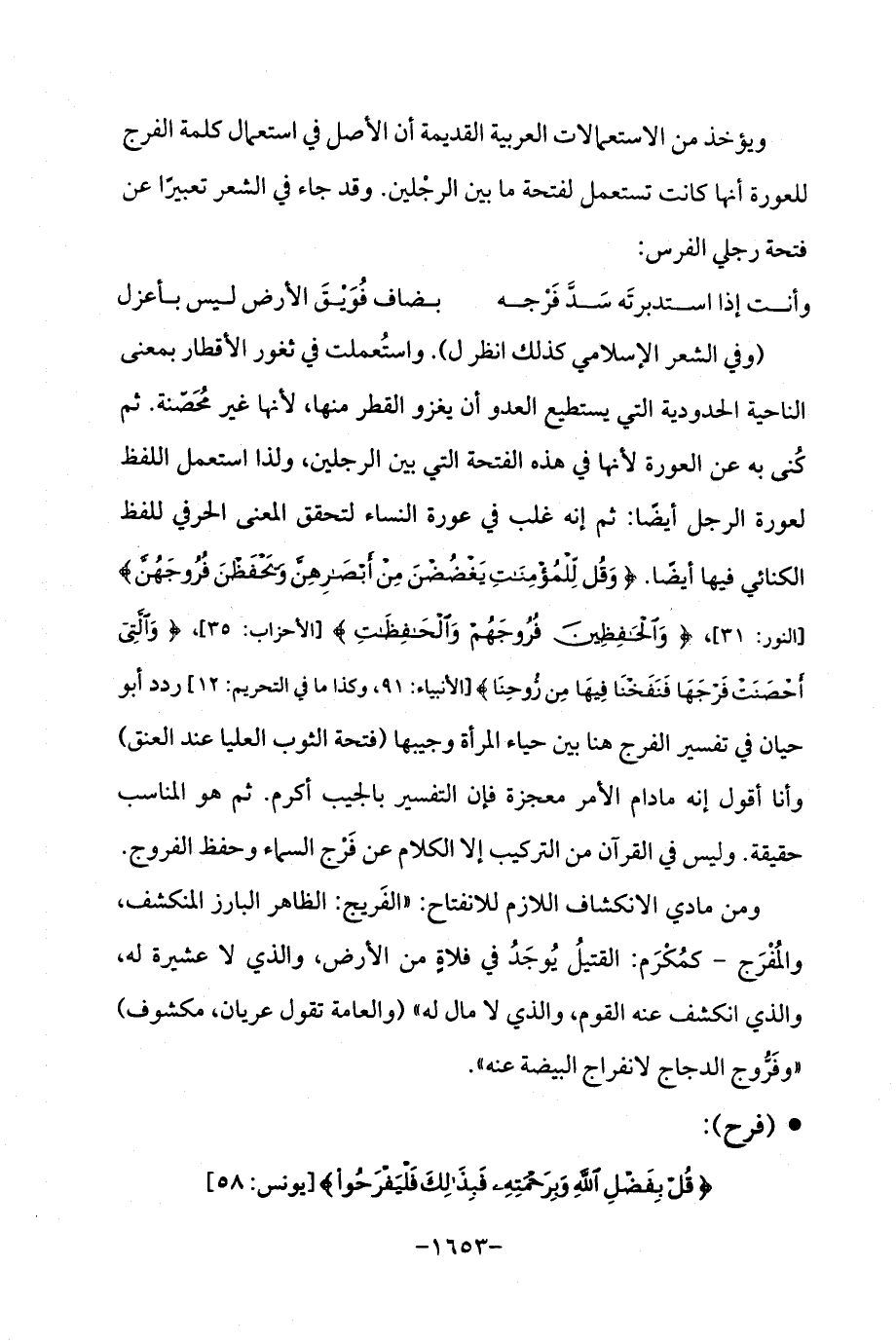 (وفي الشعر عمر الإِسلامي كذلك انظر ل). واستُعملت في ثغور الأقطار بمعنى الناحية الحدودية التي يستطيع العدو أن يغزو القطر منها؛ لأنها غير مُحَضّنة. ثم كُنى به عن العورة لأنها في هذه الفتحة التي بين الرجلين، ولذا استعمل اللفظ لعورة الرجل أيضًا: ثم إنه غلب في عورة النساء لتحقق المعنى الحرفي للفظ الكنائي فيها أيضًا. {وَقُلْ لِلْمُؤْمِنَاتِ يَغْضُضْنَ مِنْ أَبْصَارِهِنَّ وَيَحْفَظْنَ فُرُوجَهُنَّ} [النور: 31]، {وَالْحَافِظِينَ فُرُوجَهُمْ وَالْحَافِظَاتِ} [الأحزاب: 35] {وَالَّتِي أَحْصَنَتْ فَرْجَهَا فَنَفَخْنَا فِيهَا مِنْ رُوحِنَا} [الأنبياء: 91، وكذا ما في التحريم: 12] ردد أبو حيان في تفسير الفرج هنا بين حياء المرأة وجيبها (فتحة الثوب العليا عند العنق) وأنا أقول إنه مادام الأمر معجزة فإن التفسير بالجيب أكرم. ثم هو المناسب حقيقة. وليس في القرآن من التركيب إلا الكلام عن فَرْج السماء وحفظ الفروج.