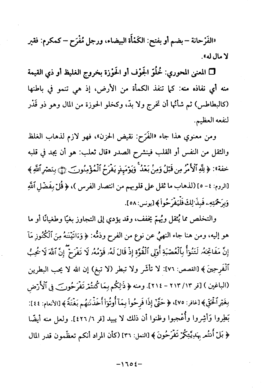 والتخلص مما يُثقل ويُهمّ يخفف، وقد يؤدي إلى التجاوز بغيًا وطغيانًا أو ما هو إليه، ومن هنا جاء النهيُ عن نوع من الفرح وذمُّه: {وَآتَيْنَاهُ مِنَ الْكُنُوزِ مَا إِنَّ مَفَاتِحَهُ لَتَنُوءُ بِالْعُصْبَةِ أُولِي الْقُوَّةِ إِذْ قَالَ لَهُ قَوْمُهُ لَا تَفْرَحْ إِنَّ اللَّهَ لَا يُحِبُّ الْفَرِحِينَ} [القصص: 76]: لا تأشَر ولا تبطر (لا تبغ) إن اللَّه لا يحب البطرين (الباغين) [قر 13/ 213 - 214]. ومنه {ذَلِكُمْ بِمَا كُنْتُمْ تَفْرَحُونَ فِي الْأَرْضِ بِغَيْرِ الْحَقِّ} [غافر: 75] {حَتَّى إِذَا فَرِحُوا بِمَا أُوتُوا أَخَذْنَاهُمْ بَغْتَةً} [الأنعام: 44]: بَطِروا وَأشروا وأُعْجبوا وظنوا أن ذلك لا يبيد [قر 6/ 426]. ولعل منه أيضًا {بَلْ أَنْتُمْ بِهَدِيَّتِكُمْ تَفْرَحُونَ} [النمل: 36] (كأن المراد أنكم تعظّمون قدر المال