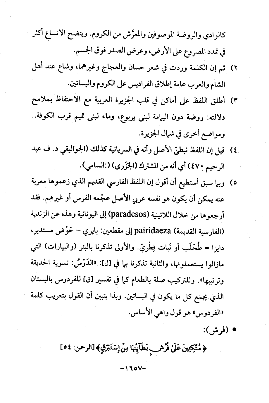 5) وبما سبق أستطيع أن أقول إن اللفظ الفارسي القديم الذي زعموها معربة عنه يمكن أن يكون هو نفسه عربي الأصل عجّمه الفرس أو غيرهم. فقد أرجعوها من خلال اللاتينية (paradesos) إلى اليونانية وهذه عن الزندية (الفارسية القديمة) pairidaeza إلى مقطعين: بايري - حَوْض مستدير، دايزا = طُحْلَب أو نَبات فِطري. والأولى تذكرنا بالبئر (والبيارات) التي ما زالوا يستعملونها، والثانية تذكرنا بما في [ل]: "الدَوْسُ: تسوية الحديقة وترتيبها ". وللتركيب صلة بالطعام كما في تفسير [ق] للفردوس بالبستان الذي يجمع كل ما يكون في البساتين. وبذا يتبين أن القول بتعريب كلمة "الفردوس "هو قول واهي الأساس.