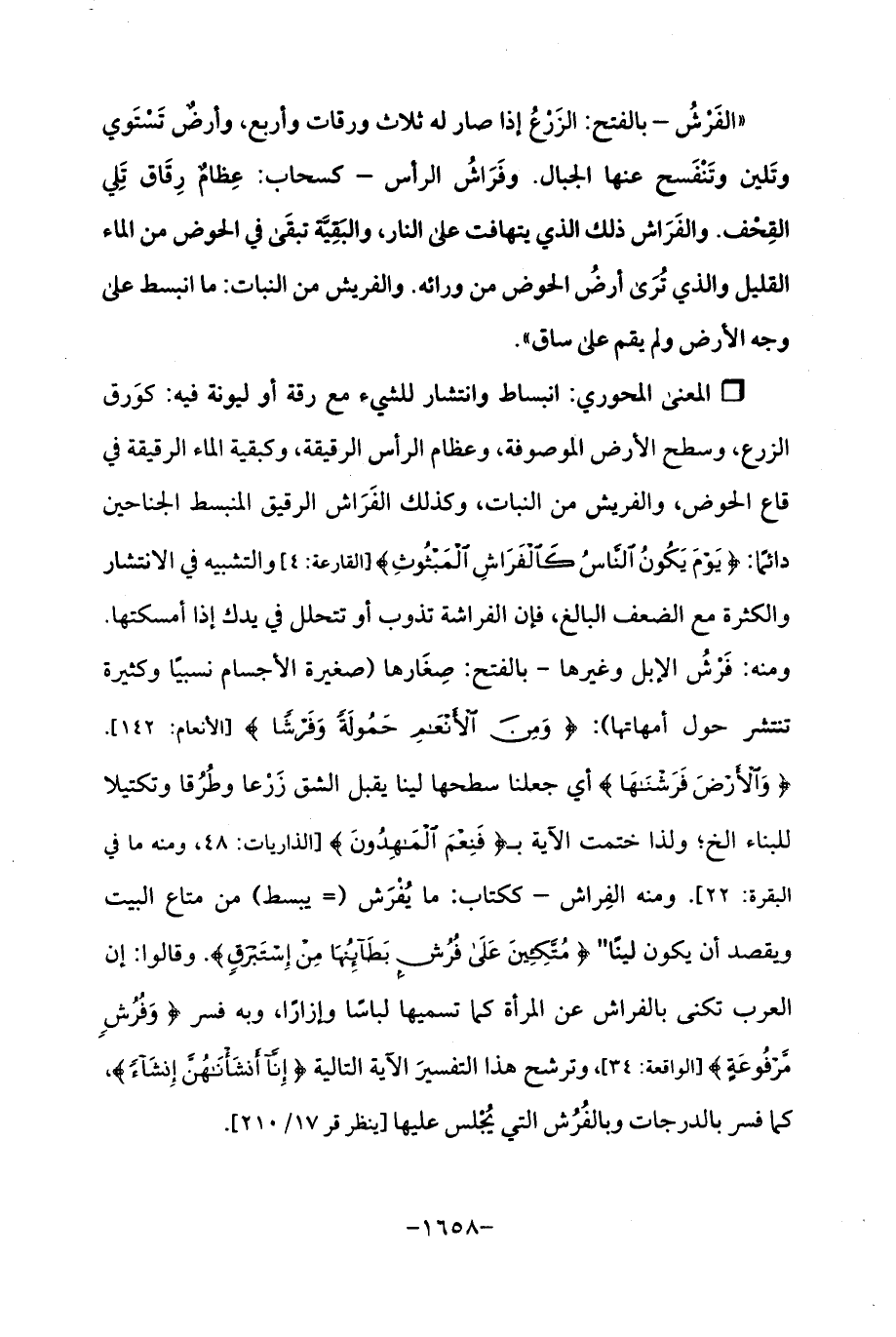 Qانبساط وانتشار للشيء مع رقة أو ليونة فيه: كوَرق الزرع، وسطح الأرض الموصوفة، وعظام الرأس الرقيقة، وكبقية الماء الرقيقة في قاع الحوض، والفريش من النبات، وكذلك الفَرَاش الرقيق المنبسط الجناحين دائما: {يَوْمَ يَكُونُ النَّاسُ كَالْفَرَاشِ الْمَبْثُوثِ} [القارعة: 4] والتشبيه في الانتشار والكثرة مع الضعف البالغ، فإن الفراشة تذوب أو تتحلل في يدك إذا أمسكتها. ومنه: فَرْشُ الإبل وغيرها -بالفتح: صِغَارها (صغيرة الأجسام نسبيًا وكثيرة تتشر حول أمهاتها): {وَمِنَ الْأَنْعَامِ حَمُولَةً وَفَرْشًا} [الأنعام: 142]. {وَالْأَرْضَ فَرَشْنَاهَا} أي جعلنا سطحها لينا يقبل الشق زَرْعا وطُرُقا وتكتيلا للبناء الخ؛ ولذا ختمت الآية بـ {فَنِعْمَ الْمَاهِدُونَ} [الذاريات: 48، ومنه ما في البقرة: 22]. ومنه الفِراش - ككتاب: ما يُفرَش (= يبسط) من متاع البيت ويقصد أن يكون لينًا " {مُتَّكِئِينَ عَلَى فُرُشٍ بَطَائِنُهَا مِنْ إِسْتَبْرَقٍ}. وقالوا: إن العرب تكنى بالفراش عن المرأة كما تسميها لباسًا وإزارًا، وبه فسر {وَفُرُشٍ مَرْفُوعَةٍ} [الواقعة: 34]، وترشح هذا التفسيرَ الآية التالية {إِنَّا أَنْشَأْنَاهُنَّ إِنْشَاءً} كما فسر بالدرجات وبالفُرُش التي يُجلس عليها [ينظر قر 17/ 210].