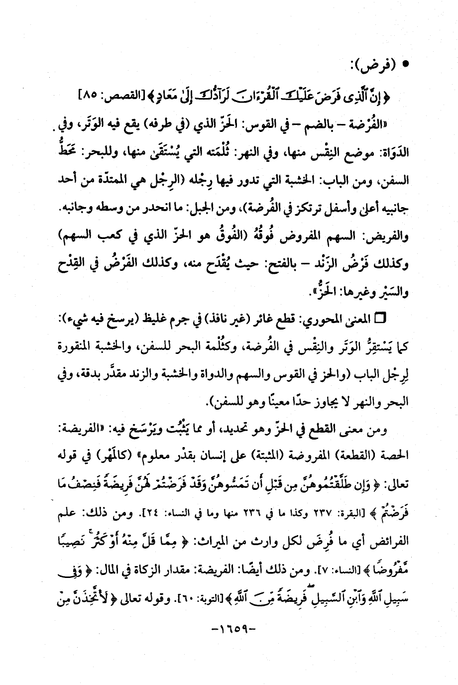 ومن معنى القطع في الحزّ وهو تحديد، أو مما يَثْبُت ويَرْسَخ فيه: "الفريضة: الحصة (القطعة) المفروضة (المثبتة) على إنسان بقدْر معلوم " (كالمَهْر) في قوله تعالى: {وَإِنْ طَلَّقْتُمُوهُنَّ مِنْ قَبْلِ أَنْ تَمَسُّوهُنَّ وَقَدْ فَرَضْتُمْ لَهُنَّ فَرِيضَةً فَنِصْفُ مَا فَرَضْتُم} [البقرة: 237 وكذا ما في 236 منها وما في النساء: 24]. ومن ذلك: علم الفرائض أي ما فُرِضَ لكل وارث من الميراث: {مِمَّا قَلَّ مِنْهُ أَوْ كَثُرَ نَصِيبًا مَفْرُوضًا} [النساء: 7]. ومن ذلك أيضًا: الفريضة: مقدار الزكاة في المال: {وَفِي سَبِيلِ اللَّهِ وَابْنِ السَّبِيلِ فَرِيضَةً مِنَ اللَّهِ} [التوبة: 60]. وقوله تعالى {لَأَتَّخِذَنَّ مِنْ
