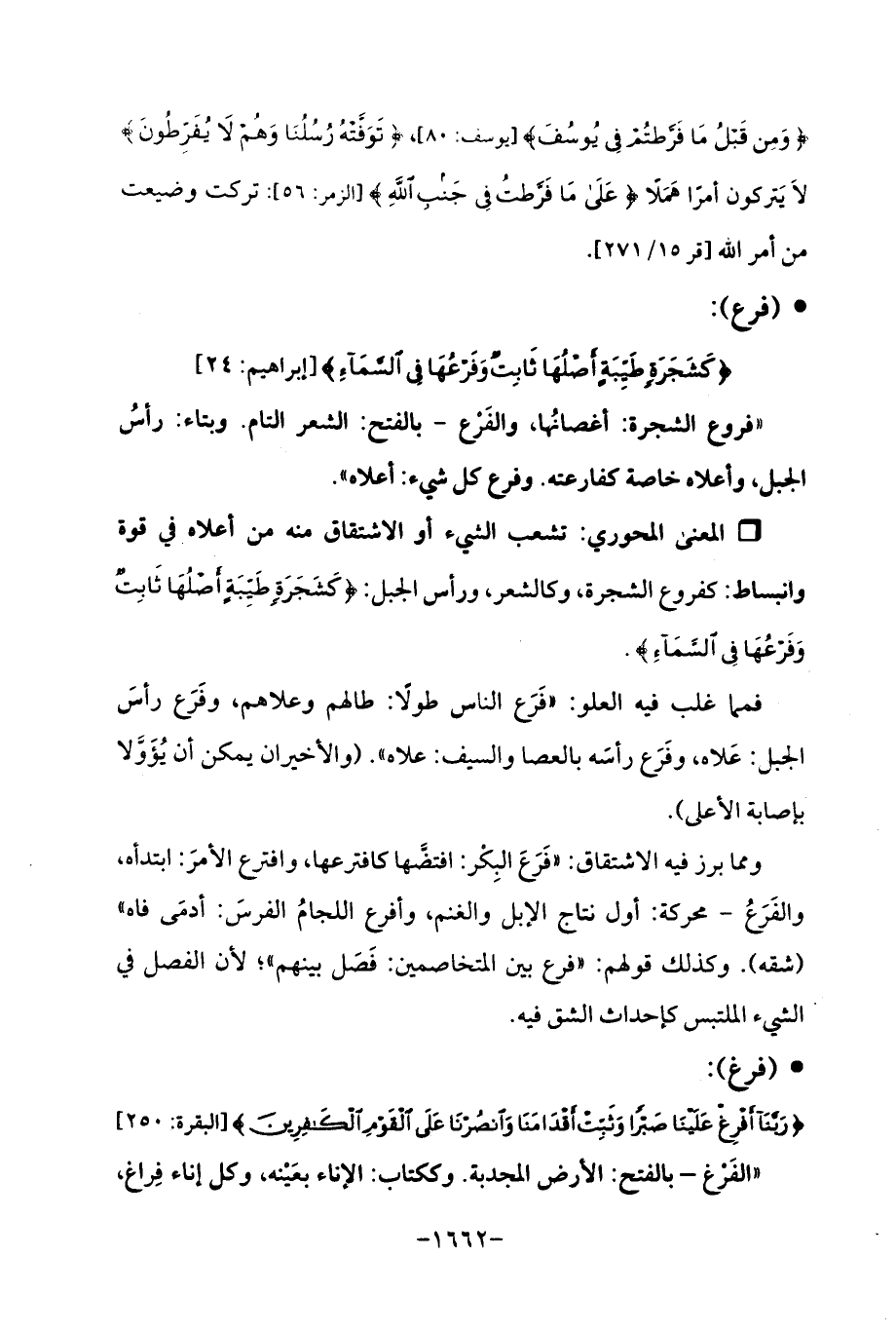 Qتشعب الشيء أو الاشتقاق منه من أعلاه في قوة وانبساط: كفروع الشجرة، وكالشعر، ورأس الجبل: {كَشَجَرَةٍ طَيِّبَةٍ أَصْلُهَا ثَابِتٌ وَفَرْعُهَا فِي السَّمَاءِ}.