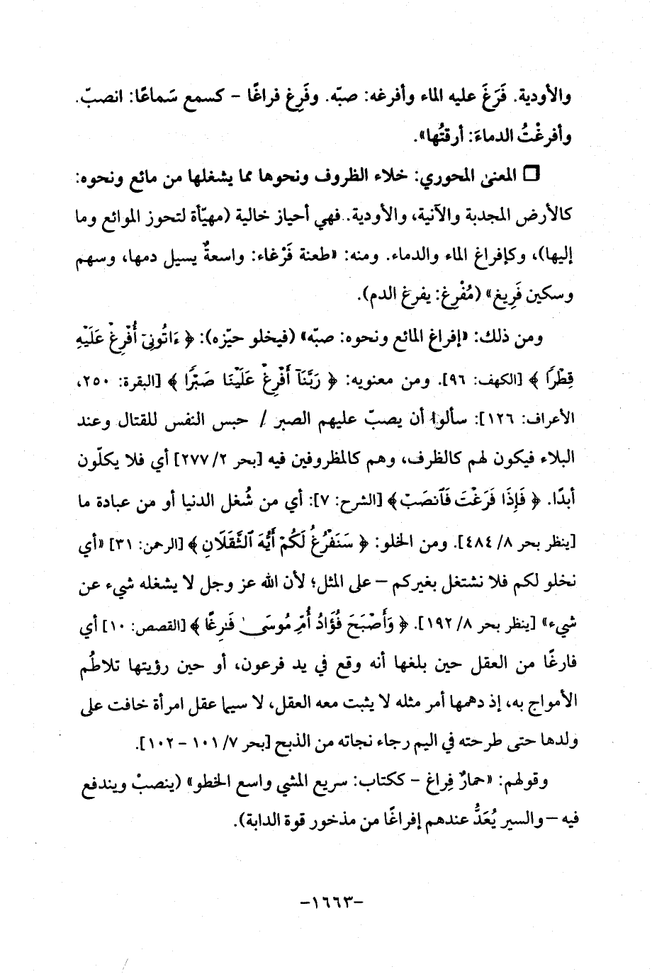ومن ذلك: "إفراغ المائع ونحوه: صبّه " (فيخلو حيّزه): {آتُونِي أُفْرِغْ عَلَيْهِ قِطْرًا} [الكهف: 96]. ومن معنويه: {رَبَّنَا أَفْرِغْ عَلَيْنَا صَبْرًا} [البقرة: 250، الأعراف: 126]: سألوا أن يصبّ عليهم الصبر/ حبس النفس للقتال وعند البلاء فيكون لهم كالظرف، وهم كالمظروفين فيه [بحر 2/ 277] أي فلا يكلّون أبدًا. {فَإِذَا فَرَغْتَ فَانْصَبْ} [الشرح: 7]: أي من شُغل الدنيا أو من عبادة ما [ينظر بحر 8/ 484]. ومن الخلو: {سَنَفْرُغُ لَكُمْ أَيُّهَ الثَّقَلَانِ} [الرحمن: 31] "أي نخلو لكم فلا نشتغل بغيركم - على المثل؛ لأن اللَّه عز وجل لا يشغله شيء عن شيء " [ينظر بحر 8/ 192]. {وَأَصْبَحَ فُؤَادُ أُمِّ مُوسَى فَارِغًا} [القصص: 10] أي فارغًا من العقل حين بلغها أنه وقع في يد فرعون، أو حين رؤيتها تلاطُم الأمواج به، إذ دهمها أمر مثله لا يثبت معه العقل، لا سيما عقل امرأة خافت على ولدها حتى طرحته في اليم رجاء نجاته من الذبح [بحر 7/ 101 - 102].