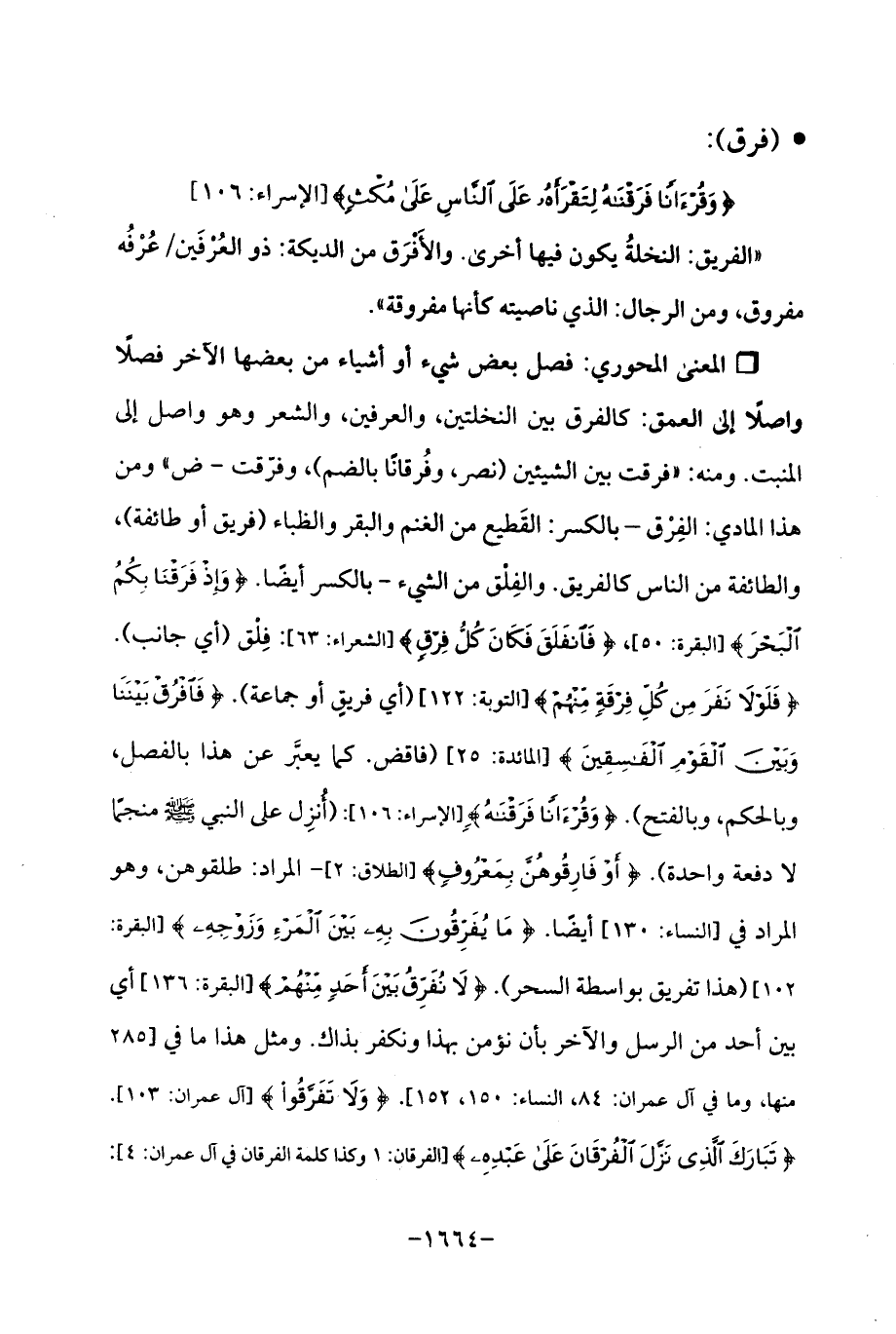Qفصل بعض شيء أو أشياء من بعضها الآخر فصلًا واصلًا إلى العمق: كالفرق بين النخلتين، والعرفين، والشعر وهو واصل إلى المنبت. ومنه: "فرقت بين الشيئين (نصر، وفُرقانًا بالضم)، وفرّقت - ض "ومن هذا المادي: الفِرْق -بالكسر: القَطيع من الغنم والبقر والظباء (فريق أو طائفة)، والطائفة من الناس كالفريق. والفِلق من الشيء -بالكسر أيضًا. {وَإِذْ فَرَقْنَا بِكُمُ الْبَحْر} [البقرة: 50]، {فَانْفَلَقَ فَكَانَ كُلُّ فِرْقٍ} [الشعراء: 63]: فِلْق (أي جانب). {فَلَوْلَا نَفَرَ مِنْ كُلِّ فِرْقَةٍ مِنْهُمْ} [التوبة: 122] (أي فريقٍ أو جماعة). {فَافْرُقْ بَيْنَنَا وَبَيْنَ الْقَوْمِ الْفَاسِقِينَ} [المائدة: 25] (فاقض. كما يعبَّر عن هذا بالفصل، وبالحكم، وبالفتح). {وَقُرْآنًا فَرَقْنَاهُ} [الإسراء: 106]: (أُنزِل على النبي -صلى اللَّه عليه وسلم- منجمًا لا دفعة واحدة). {أَوْ فَارِقُوهُنَّ بِمَعْرُوفٍ} [الطلاق: 2]- المراد: طلقوهن، وهو المراد في [النساء: 130] أيضًا. {مَا يُفَرِّقُونَ بِهِ بَيْنَ الْمَرْءِ وَزَوْجِهِ} [البقرة: 102] (هذا تفريق بواسطة السحر). {لَا نُفَرِّقُ بَيْنَ أَحَدٍ مِنْهُمْ} [البقرة: 136] أي بين أحد من الرسل والآخر بأن نؤمن بهذا ونكفر بذاك. ومثل هذا ما في [285 منها، وما في آل عمران: 84، النساء: 150، 152]. {وَلَا تَفَرَّقُوا} [آل عمران: 103]. {تَبَارَكَ الَّذِي نَزَّلَ الْفُرْقَانَ عَلَى عَبْدِهِ} [الفرقان: 1 وكذا كلمة الفرقان في آل عمران: 4]: