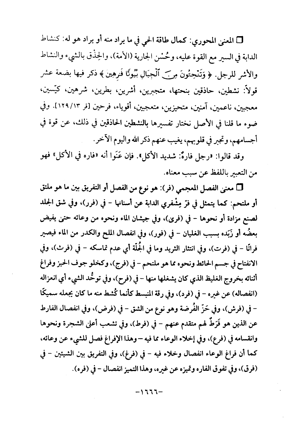 Qكمال طاقة الحي في ما يراد منه أو يراد هو له: كنشاط الدابة في السير مع القوة عليه، وحُسن الجارية (الأمة)، والحِذْق بالشيء والنشاط والأشر للرجل. {وَتَنْحِتُونَ مِنَ الْجِبَالِ بُيُوتًا فَارِهِينَ} ذكر فيها بضعة عشر قولًا: نشطين، حاذقين بنحتها، متجبرين، أشرين، بطرين، شرهين، كيّسين، معجبين، ناعمين، آمنين، متحيزين، متعجبين، أقوياء، فرحين [قر 13/ 129]. وفي ضوء ما قلنا في الأصل نختار تفسيرها بالنشطين الحاذقين في ذلك، عن قوة في أجسامهم، وتجبر في قلوبهم، يغيب عنهم ذكر اللَّه واليوم الآخر.