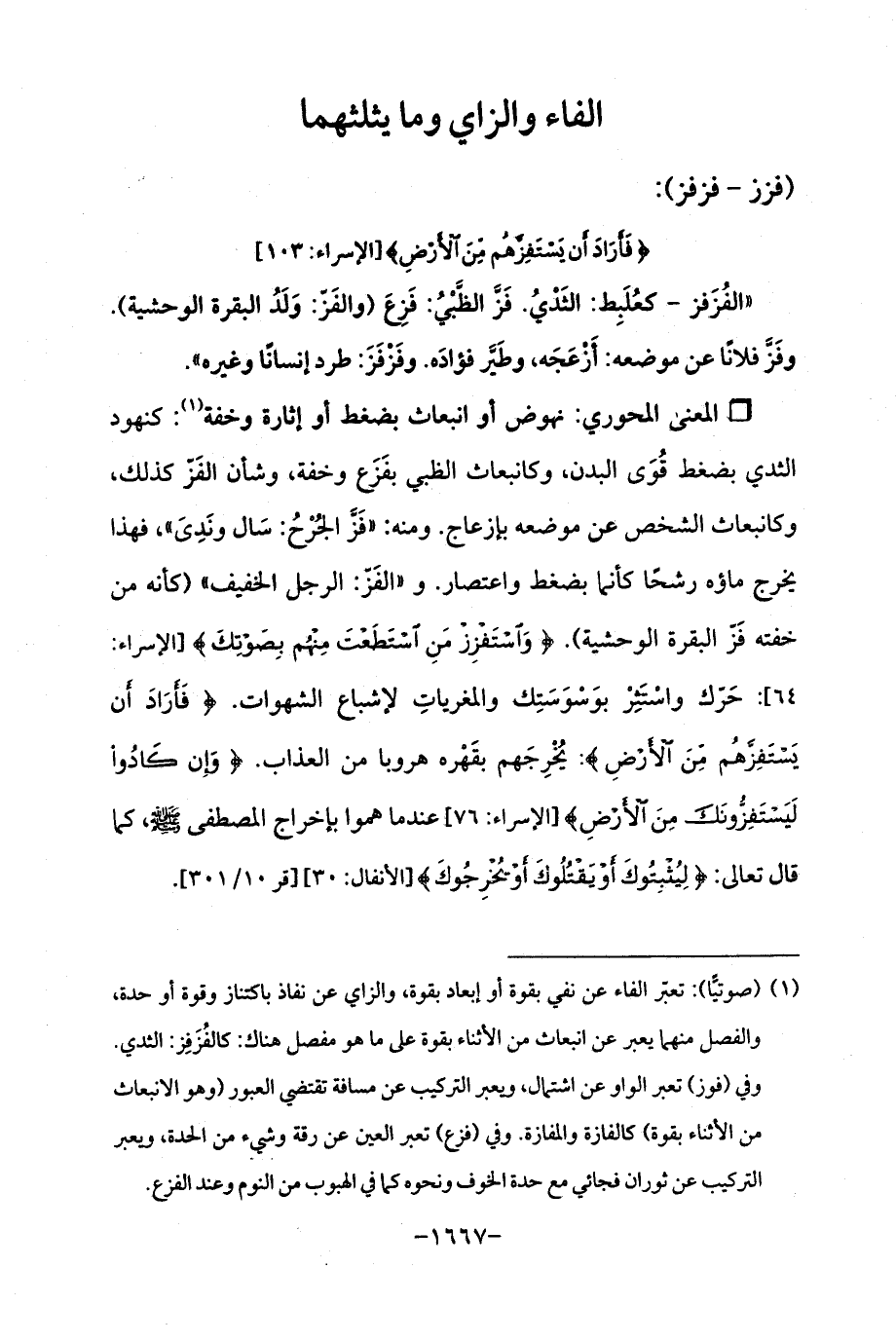Qنهوض أو انبعاث بضغط أو إثارة وخفة (¬1): كنهود الثدي بضغط قُوَى البدن، وكانبعاث الظبي بفَزَع وخفة، وشأن الفَزّ كذلك، وكانبعاث الشخص عن موضعه بإزعاج. ومنه: "فَزَّ الجُرْحُ: سَال ونَدِىَ "، فهذا يخرج ماؤه رشحًا كأنما بضغط واعتصار. و "الفَزّ: الرجل الخفيف " (كأنه من خفته فَزّ البقرة الوحشية). {وَاسْتَفْزِزْ مَنِ اسْتَطَعْتَ مِنْهُمْ بِصَوْتِكَ} [الإسراء: 64]: حَرّك واستَثِر بوَسْوَسَتِك والمغرياتِ لإشباع الشهوات. {فَأَرَادَ أَنْ يَسْتَفِزَّهُمْ مِنَ الْأَرْضِ}: يُخْرِجَهم بقَهْره هروبا من العذاب. {وَإِنْ كَادُوا لَيَسْتَفِزُّونَكَ مِنَ الْأَرْضِ} [الإسراء: 76]، عندما هموا بإخراج المصطفى -صلى اللَّه عليه وسلم-، كما قال تعالى: {لِيُثْبِتُوكَ أَوْ يَقْتُلُوكَ أَوْ يُخْرِجُوكَ} [الأنفال: 30] [قر 10/ 301].
