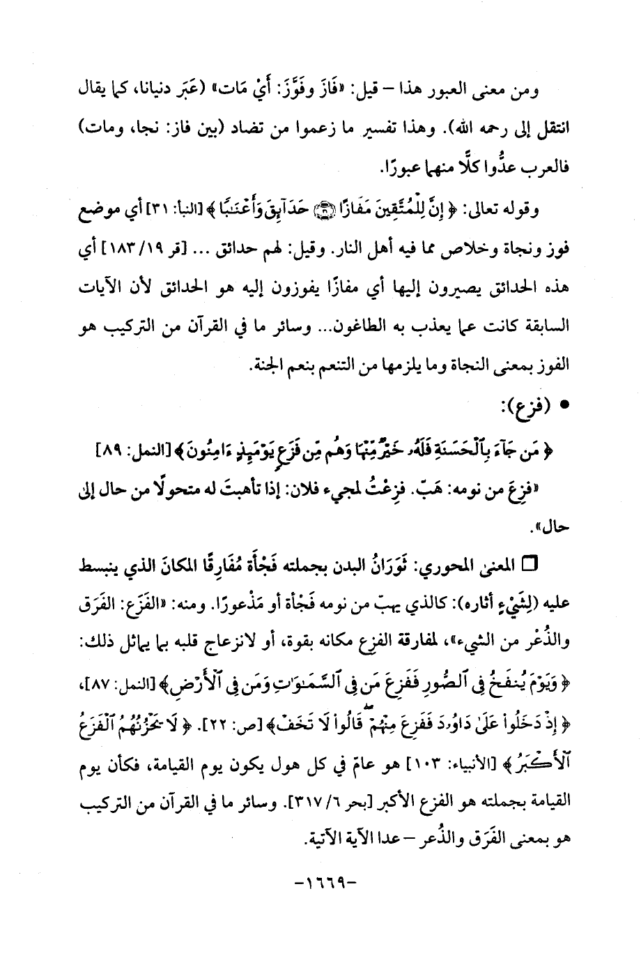 Qثَوَرَانُ البدن بجملته فَجأَة مُفَارِقًا المكانَ الذي ينبسط عليه (لِشَيْءٍ أثاره): كالذي يهبّ من نومه فَجْأة أو مَذْعورًا. ومنه: "الفَزَع: الفَرَق والذُعْر من الشيء "، لمفارقة الفزع مكانه بقوة، أو لانزعاج قلبه يماثل ذلك: {وَيَوْمَ يُنْفَخُ فِي الصُّورِ فَفَزِعَ مَنْ فِي السَّمَاوَاتِ وَمَنْ فِي الْأَرْضِ} [النمل: 87]، {إِذْ دَخَلُوا عَلَى دَاوُودَ فَفَزِعَ مِنْهُمْ قَالُوا لَا تَخَفْ} [ص: 22]. {لَا يَحْزُنُهُمُ الْفَزَعُ الْأَكْبَرُ} [الأنبياء: 103] هو عامّ في كل هول يكون يوم القيامة، فكأن يوم القيامة بجملته هو الفزع الأكبر [بحر 6/ 317]. وسائر ما في القرآن من التركيب هو بمعنى الفَرَق والذُعر -عدا الآية الآتية.