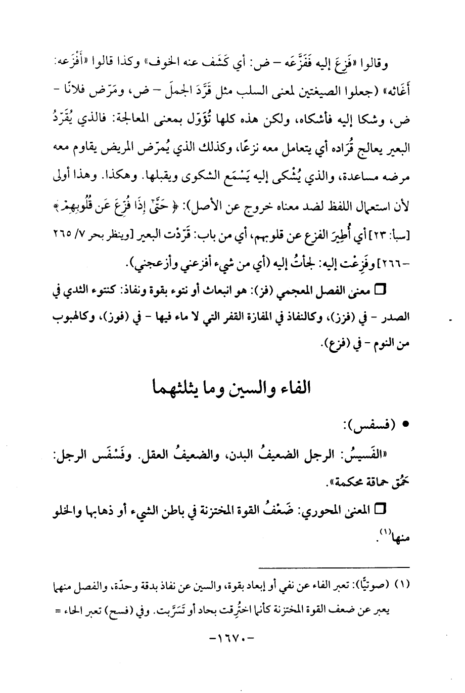 ° معنى الفصل المعجمي (فز): هو انبعاث أو نتوء بقوة ونفاذ: كنتوء الثدي في الصدر -في (فزز)، وكالنفاذ في المفازة القفر التي لا ماء فيها -في (فوز)، وكالهبوب من النوم -في (فزع).