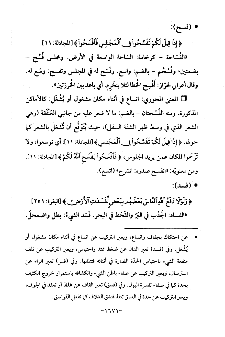 Qاتساع في أثناء مكان مشغول أو يُشْغَل: كالأماكن المذكورة. ومنه الفُسْحتان -بالضم: ما لا شعر عليه من جانبي العَنْفَقة (وهي الشعر الذي في وسط ظهر الشفة السفلي)، حيث يُتَوَقَّع أن تُشغل بالشعر كما حولها. {إِذَا قِيلَ لَكُمْ تَفَسَّحُوا فِي الْمَجَالِسِ} [المجادلة: 11]: أي توسعوا، ولا تَزْحَموا المكان عمن يريد الجلوس، {فَافْسَحُوا يَفْسَحِ اللَّهُ لَكُمْ} [المجادلة: 11]. ومن معنويّه: "انفسح صدره: انشرح " (اتسع).