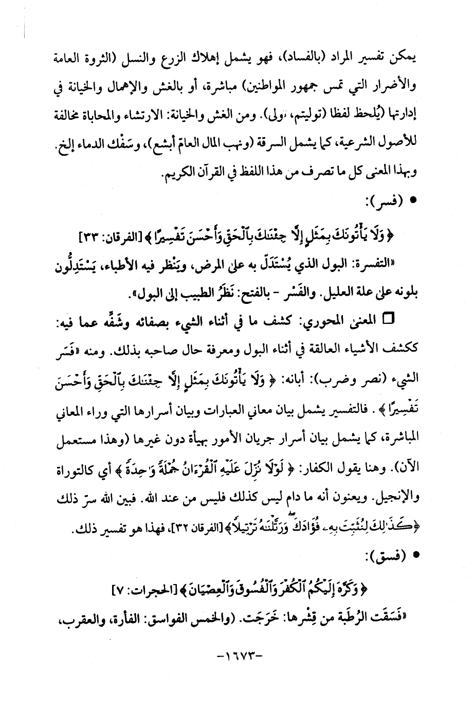 Qكشف ما في أثناء الشيء بصفائه وشَفِّه عما فيه: ككشف الأشياء العالقة في أثناء البول ومعرفة حال صاحبه بذلك. ومنه "فَسَر الشيء (نصر وضرب): أبانه: {وَلَا يَأْتُونَكَ بِمَثَلٍ إِلَّا جِئْنَاكَ بِالْحَقِّ وَأَحْسَنَ تَفْسِيرًا}. فالتفسير يشمل بيان معاني العبارات وبيان أسرارها التي وراء المعاني المباشرة، كما يشمل بيان أسرار جريان الأمور بهيأة دون غيرها (وهذا مستعمل الآن). وهنا يقول الكفار: {لَوْلَا نُزِّلَ عَلَيْهِ الْقُرْآنُ جُمْلَةً وَاحِدَةً} أي كالتوراة والإنجيل. ويعنون أنه ما دام ليس كذلك فليس من عند اللَّه. فبين اللَّه سرّ ذلك {كَذَلِكَ لِنُثَبِّتَ بِهِ فُؤَادَكَ وَرَتَّلْنَاهُ تَرْتِيلًا} [الفرقان: 32]، فهذا هو تفسير ذلك.