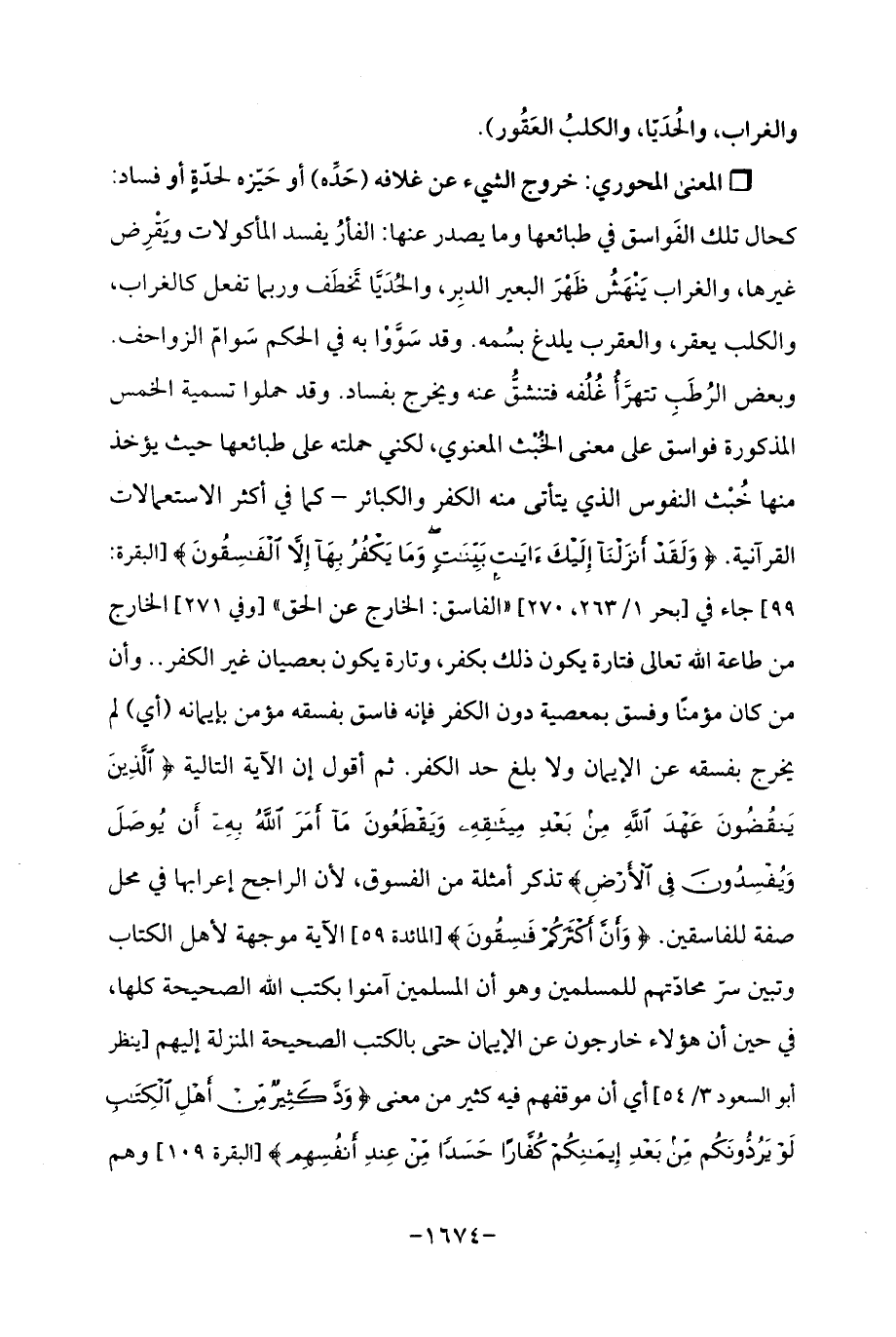 Qخروج الشيء عن غلافه (حَدِّه) أو حَيّزه لحدّةٍ أو فساد: كحال تلك الفَواسق في طبائعها وما يصدر عنها: الفأرُ يفسد المأكولات ويَقْرِض غيرها، والغراب يَنْهَشُ ظَهْرَ البعير الدبِر، والحُدَيَّا تَخطَف وربا تفعل كالغراب، والكلب يعقر، والعقرب يلدغ بسُمه. وقد سَوَّوْا به في الحكم سَوامّ الزواحف. وبعض الرُطَبِ تتهرَّأُ غُلُفه فتنشقُّ عنه ويخرج بفساد. وقد حملوا تسمية الخمس المذكورة فواسق على معنى الخُبْث المعنوي، لكني حملته على طبائعها حيث يؤخذ منها خُبْث النفوس الذي يتأتي منه الكفر والكبائر -كما في أكثر الاستعمالات القرآنية {وَلَقَدْ أَنْزَلْنَا إِلَيْكَ آيَاتٍ بَيِّنَاتٍ وَمَا يَكْفُرُ بِهَا إِلَّا الْفَاسِقُونَ} [البقرة: 99]. جاء في [بحر 1/ 263، 270] "الفاسق: الخارج عن الحق " [وفي 271] الخارج من طاعة اللَّه تعالى فتارة يكون ذلك بكفر، وتارة يكون بعصيان غير الكفر. . وأن من كان مؤمنًا وفسق بمعصية دون الكفر فإنه فاسق بفسقه مؤمن بإيمانه (أي) لم يخرج بفسقه عن الإيمان ولا بلغ حد الكفر. ثم أقول إن الآية التالية {الَّذِينَ يَنْقُضُونَ عَهْدَ اللَّهِ مِنْ بَعْدِ مِيثَاقِهِ وَيَقْطَعُونَ مَا أَمَرَ اللَّهُ بِهِ أَنْ يُوصَلَ وَيُفْسِدُونَ فِي الْأَرْضِ} تذكر أمثلة من الفسوق، لأن الراجح إعرابها في محل صفة للفاسقين. {وَأَنَّ أَكْثَرَكُمْ فَاسِقُونَ} [المائدة: 59] الآية موجهة لأهل الكتاب وتبين سرّ محادّتهم للمسلمين وهو أن المسلمين آمنوا بكتب اللَّه الصحيحة كلها، في حين أن هؤلاء خارجون عن الإيمان حتى بالكتب الصحيحة المنزلة إليهم [ينظر أبو السعود 3/ 54] أي أن موقفهم فيه كثير من معنى {وَدَّ كَثِيرٌ مِنْ أَهْلِ الْكِتَابِ لَوْ يَرُدُّونَكُمْ مِنْ بَعْدِ إِيمَانِكُمْ كُفَّارًا حَسَدًا مِنْ عِنْدِ أَنْفُسِهِمْ} [البقرة: 109] وهم