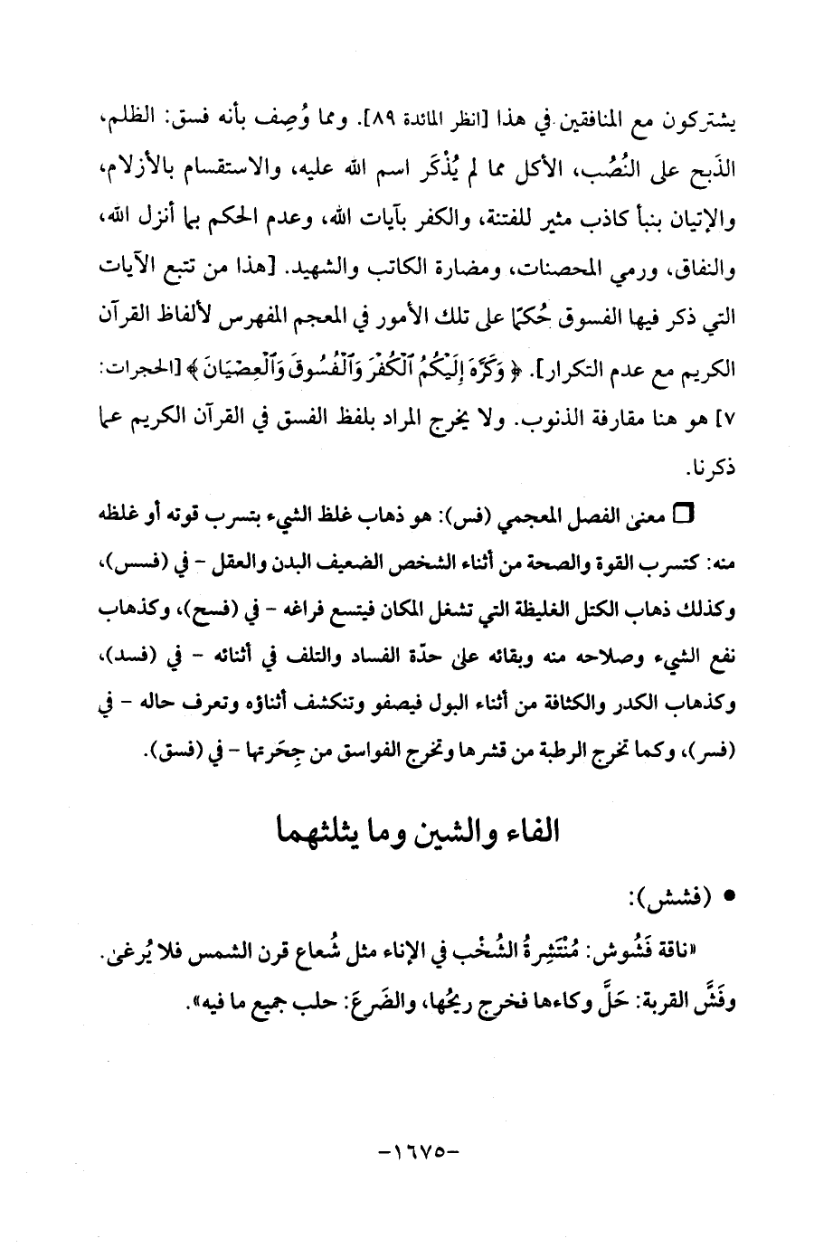 ° معنى الفصل المعجمي (فس): هو ذهاب غلظ الشيء بتسرب قوته أو غلظه منه: كتسرب القوة والصحة من أثناء الشخص الضعيف البدن والعقل -في (فسس)، وكذلك ذهاب الكتل الغليظة التي تشغل المكان فيتسع فراغه -في (فسح)، وكذهاب نفع الشيء وصلاحه منه وبقائه على حدّة الفساد والتلف في أثنائه -في (فسد)، وكذهاب الكدر والكثافة من أثناء البول فيصفو وتنكشف أثناؤه وتعرف حاله -في (فسر)، وكما تخرج الرطبة من قشرها وتخرج الفواسق من جِحَرتها -في (فسق).
