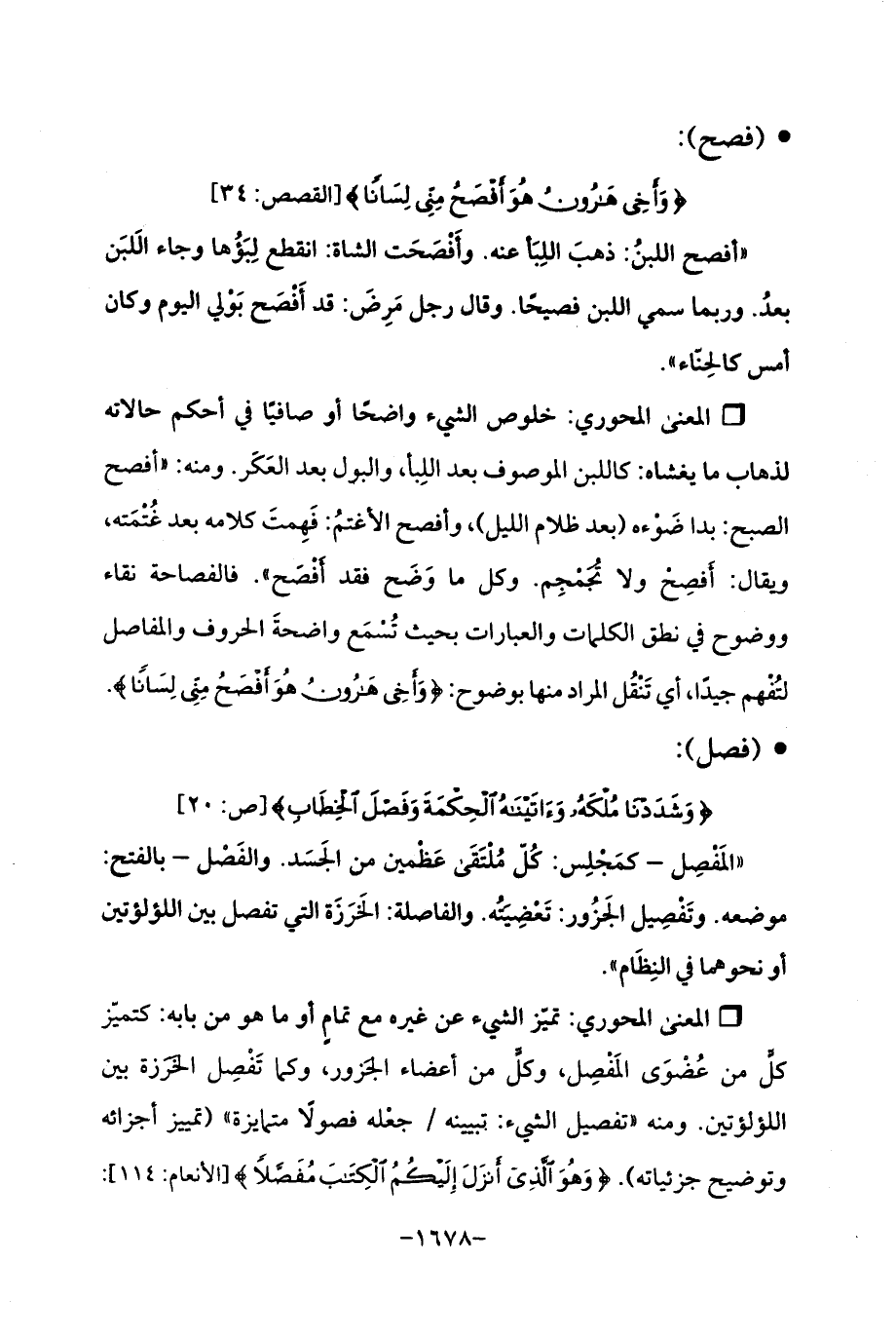 Qخلوص الشيء واضحًا أو صافيًا في أحكم حالاته لذهاب ما يغشاه: كاللبن الموصوف بعد اللِبأ، والبول بعد العَكر. ومنه: "أفصح الصبح: بدا ضَوْءه (بعد ظلام الليل)، وأفصح الأغتمُ: فَهِمتَ كلامه بعد غُتْمَته، ويقال: أَفصِحْ ولا تُجَمْجِم. وكل ما وَضَح فقد أَفْصَح ". فالفصاحة نقاء ووضوح في نطق الكلمات والعبارات بحيث تُسْمَع واضحةَ الحروف والمفاصل لتُفْهم جيدًا، أي تَنْقُل المراد منها بوضوح: {وَأَخِي هَارُونُ هُوَ أَفْصَحُ مِنِّي لِسَانًا}.
