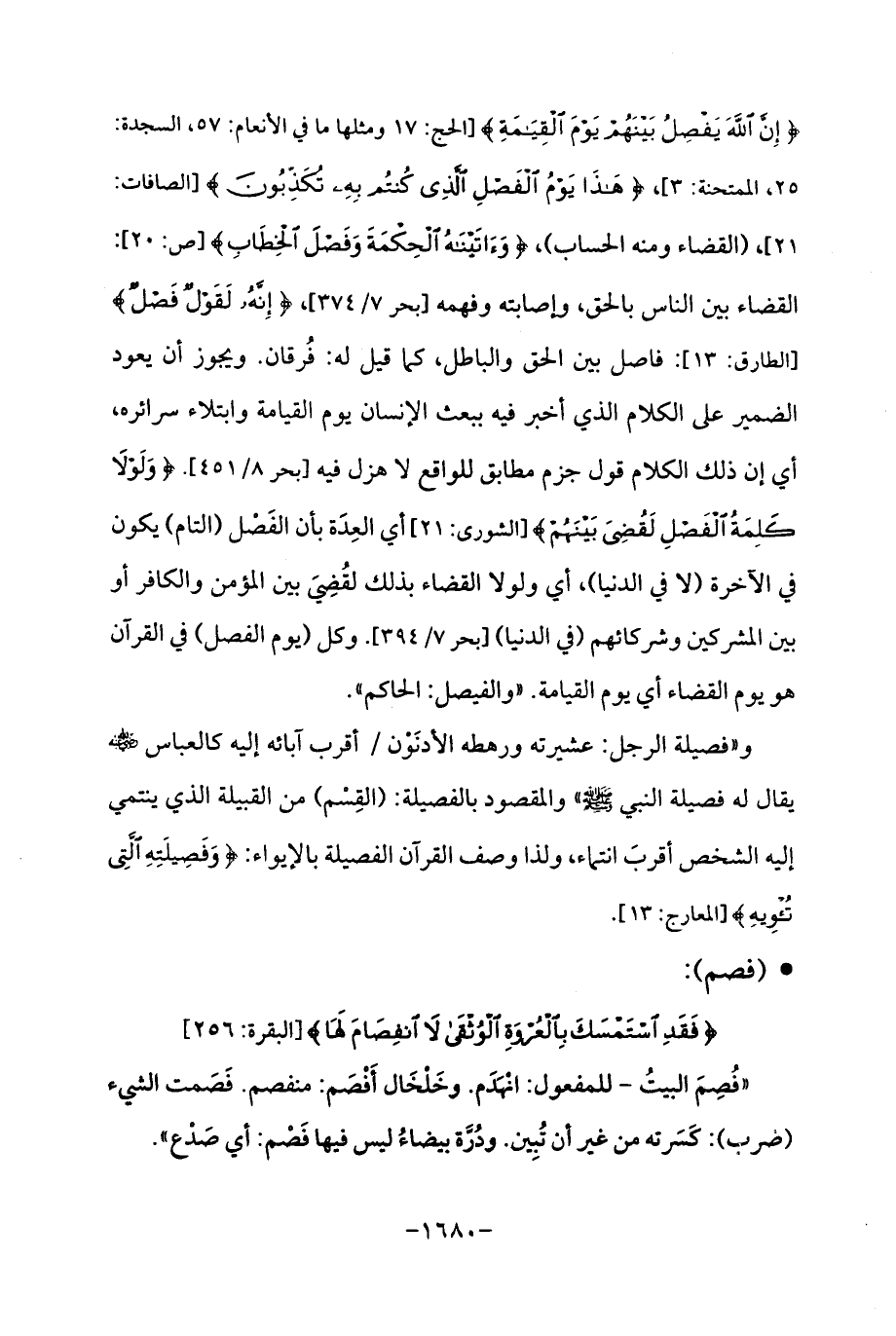 {إِنَّ اللَّهَ يَفْصِلُ بَيْنَهُمْ يَوْمَ الْقِيَامَةِ} [الحج: 17 ومثلها ما في الأنعام: 57، السجدة: 25، الممتحنة: 3]، {هَذَا يَوْمُ الْفَصْلِ الَّذِي كُنْتُمْ بِهِ تُكَذِّبُونَ} [الصافات: 21]، (القضاء ومنه الحساب)، {وَآتَيْنَاهُ الْحِكْمَةَ وَفَصْلَ الْخِطَابِ} [ص: 20]: القضاء بين الناس بالحق، وإصابته وفهمه [بحر 7/ 374]، {إِنَّهُ لَقَوْلٌ فَصْلٌ} [الطارق: 13]: فاصل بين الحق والباطل، كما قيل له: فُرقان. ويجوز أن يعود الضمير على الكلام الذي أخبر فيه ببعث الإنسان يوم القيامة وابتلاء سرائره، أي إن ذلك الكلام قول جزم مطابق للواقع لا هزل فيه [بحر 8/ 451]. {وَلَوْلَا كَلِمَةُ الْفَصْلِ لَقُضِيَ بَيْنَهُمْ} [الشورى: 21] أي العِدَة بأن الفَصْل (التام) يكون في الآخرة (لا في الدنيا)، أي ولولا القضاء بذلك لقُضِيَ بين المؤمن والكافر أو بين المشركين وشركائهم (في الدنيا) [بحر 7/ 394]. وكل (يوم الفصل) في القرآن هو يوم القضاء أي يوم القيامة. "والفيصل: الحاكم ".
