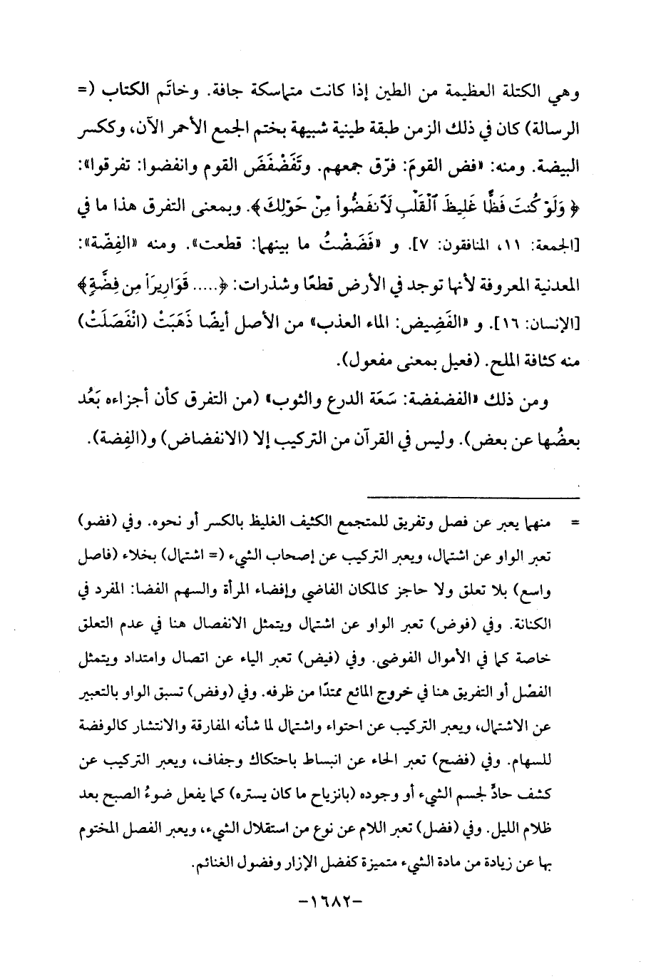 وهي الكتلة العظيمة من الطين إذا كانت متماسكة جافة. وخاتَم الكتاب (= الرسالة) كان في ذلك الزمن طبقة طينية شبيهة بختم الجمع الأحمر الآن، وككسر البيضة. ومنه: "فض القومَ: فرّق جمعهم. وتَفَضْفَضَ القوم وانفضوا: تفرقوا ": {وَلَوْ كُنْتَ فَظًّا غَلِيظَ الْقَلْبِ لَانْفَضُّوا مِنْ حَوْلِكَ}. وبمعنى التفرق هذا ما في [الجمعة: 11، المنافقون: 7]. و "فَضَضْتُ ما بينهما: قطعت ". ومنه "الفِضّة ": المعدنية المعروفة لأنها توجد في الأرض قطعًا وشذرات: {. . . قَوَارِيرَ مِنْ فِضَّةٍ} [الإنسان: 16]. و "الفَضِيض: الماء العذب "من الأصل أيضًا ذَهَبَت (انْفَصَلَتْ) منه كثافة الملح. (فعيل بمعنى مفعول).