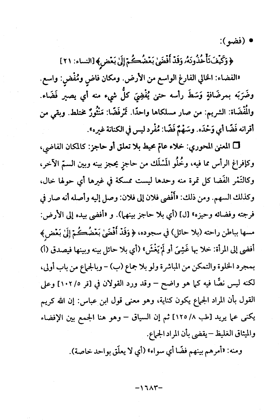 Qخلاء عامّ محيط بلا تعلق أو حاجز: كالمكان الفاضي، وكإفراغ الرأس مما فيه، وخُلُو المَسْلَك من حاجرٍ يحجز بينه وبين السمّ الآخر، وكالتَمْر الفَضا كل تمرة منه وحدها ليست ممسكة في غيرها أي حولها خال، وكذلك السهم. ومن ذلك: "أَفْضي فلان إلى فلان: وصل إليه وأصله أنه صار في فرجته وفضائه وحيزه " [ل] (أي بلا حاجز بينهما). و "أفضى يده إلى الأرض: مسها بباطن راحته (بلا حائل) في سجوده، {وَقَدْ أَفْضَى بَعْضُكُمْ إِلَى بَعْضٍ} أفضى إلى المرأة: خلا بها غَشِيَ أو لَمْ يَغْشَ " (أي بلا حائل بينه وبينها فيصدق (أ) بمجرد الخلوة والتمكن من المباشرة ولو بلا جماع (ب) - وبالجماع من باب أولى، لكنه ليس نصًّا فيه كما هو واضح - وقد ورد القولان في [قر 5/ 102] وعلي القول بأن المراد الجماع يكون كناية، وهو معنى قول ابن عباس: إن اللَّه كريم يكنى عما يريد [طب 8/ 125] ثم إن السياق -وهو هنا الجمع بين الإفضاء والميثاق الغليظ- يقضي بأن المراد الجماع.