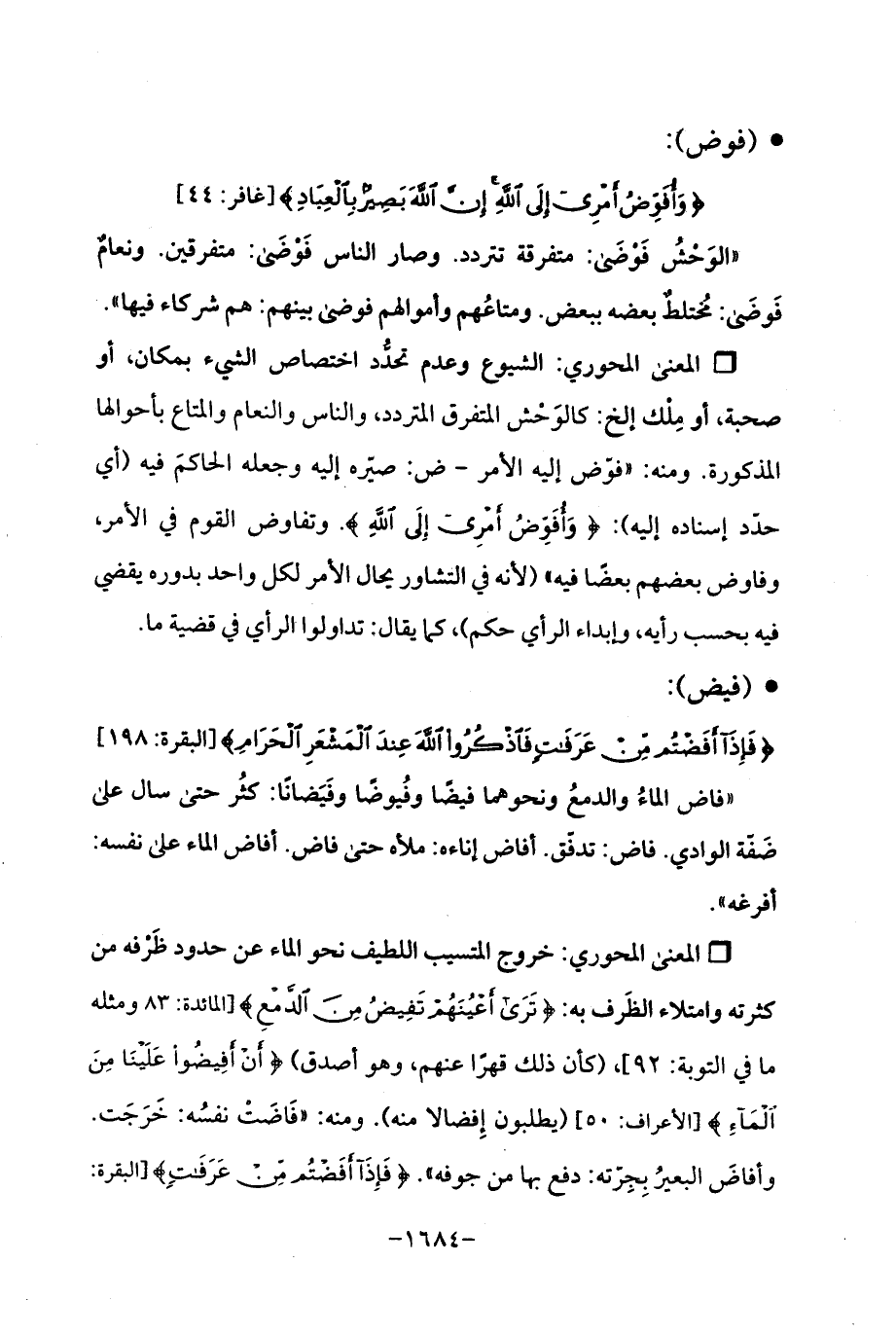 Qخروج المتسيب اللطيف نحو الماء عن حدود ظَرْفه من كثرته وامتلاء الظَرف به: {تَرَى أَعْيُنَهُمْ تَفِيضُ مِنَ الدَّمْعِ} [المائدة: 83 ومثله ما في التوبة: 92]، (كأن ذلك قهرًا عنهم، وهو أصدق) {أَنْ أَفِيضُوا عَلَيْنَا مِنَ الْمَاءِ} [الأعراف: 50] (يطلبون إِفضالا منه). ومنه: "فَاضَتْ نفسُه: خَرَجَت. وأفاضَ البعيرُ بِجِرّته: دفع بها من جوفه ". {فَإِذَا أَفَضْتُمْ مِنْ عَرَفَاتٍ} [البقرة:
