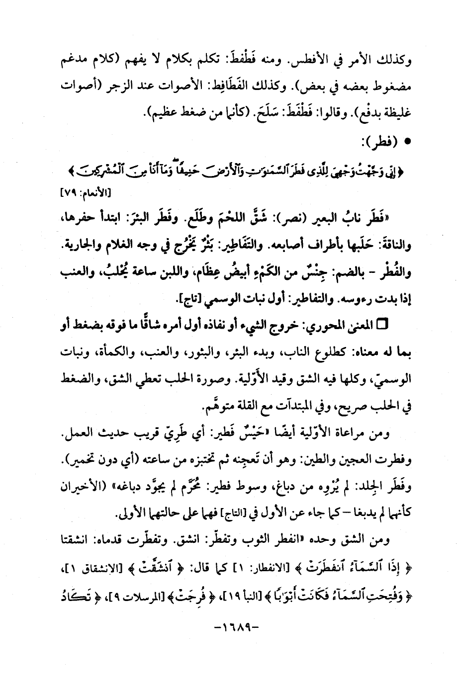 "فَطَر نابُ البعير (نصر)؛ شَقَّ اللحْمَ وطَلَع. وفطَر البئرَ: ابتدأ حفرها، والناقةَ: حَلَبها بأطراف أصابعه. والتَفَاطِير: بَثْرٌ يَخْرُج في وجه الغلام والجارية. والفُطْر -بالضم: جِنْسٌ من الكمء أبيضُ عِظَام، واللبن ساعة يُحْلبُ، والعنب إذا بدت رءوسه. والتفاطير: أول نبات الوسمي [تاج].