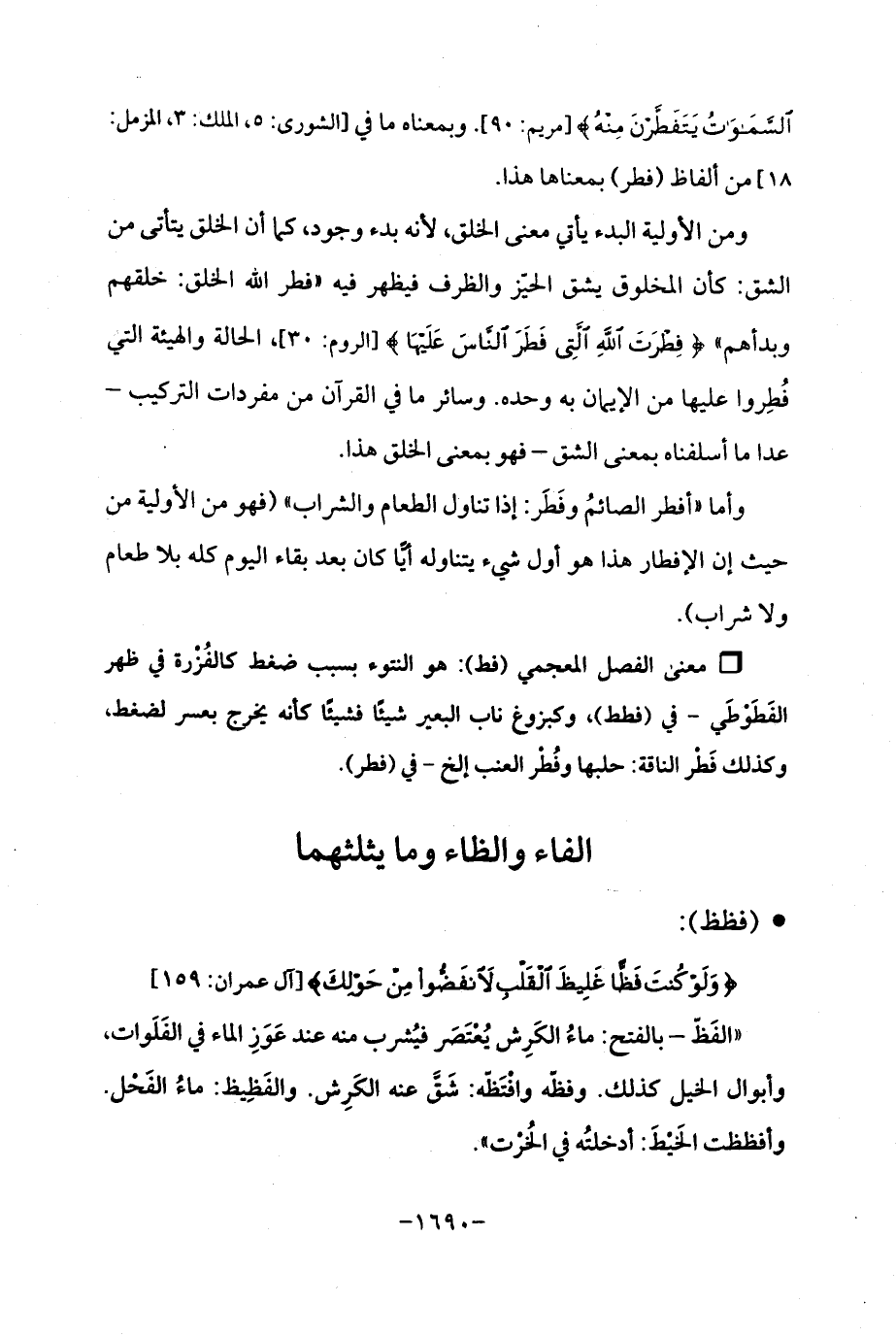 ° معنى الفصل المعجمي (فط): هو النتوء بسبب ضغط كالفُزْرة في ظهر الفَطَوْطَي -في (فطط)، وكبزوغ ناب البعير شيئًا فشيئًا كأنه يخرج بعسر لضغط، وكذلك فَطْر الناقة: حلبها وفُطْر العنب إلخ -في (فطر).