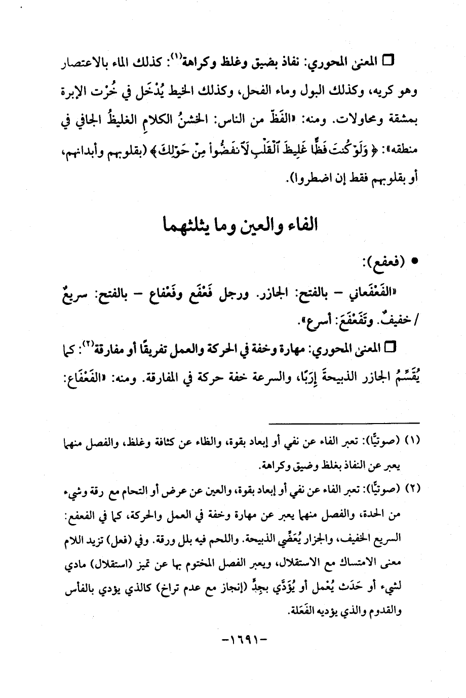 (¬2) (صوتيًّا): تعبر الفاء عن نفي أو إبعاد بقوة، والعين عن عرض أو التحام مع رقة وشيء من الحدة، والفصل منهما يعبر عن مهارة وخفة في العمل والحركة، كما في الفعفع: السريع الخفيف، والجزار يُعَضِّي الذبيحة. واللحم فيه بلل ورقة. وفي (فعل) تزيد اللام معنى الامتساك مع الاستقلال, ويعبر الفصل المختوم بها عن تميز (استقلال) مادي لشيء أو حَدَث يُعْمل أو يُؤَدَّي بجِدٍّ (إنجاز مع عدم تراخ) كالذي يؤدي بالفأس والقدوم والذي يؤديه الفَعَلة.