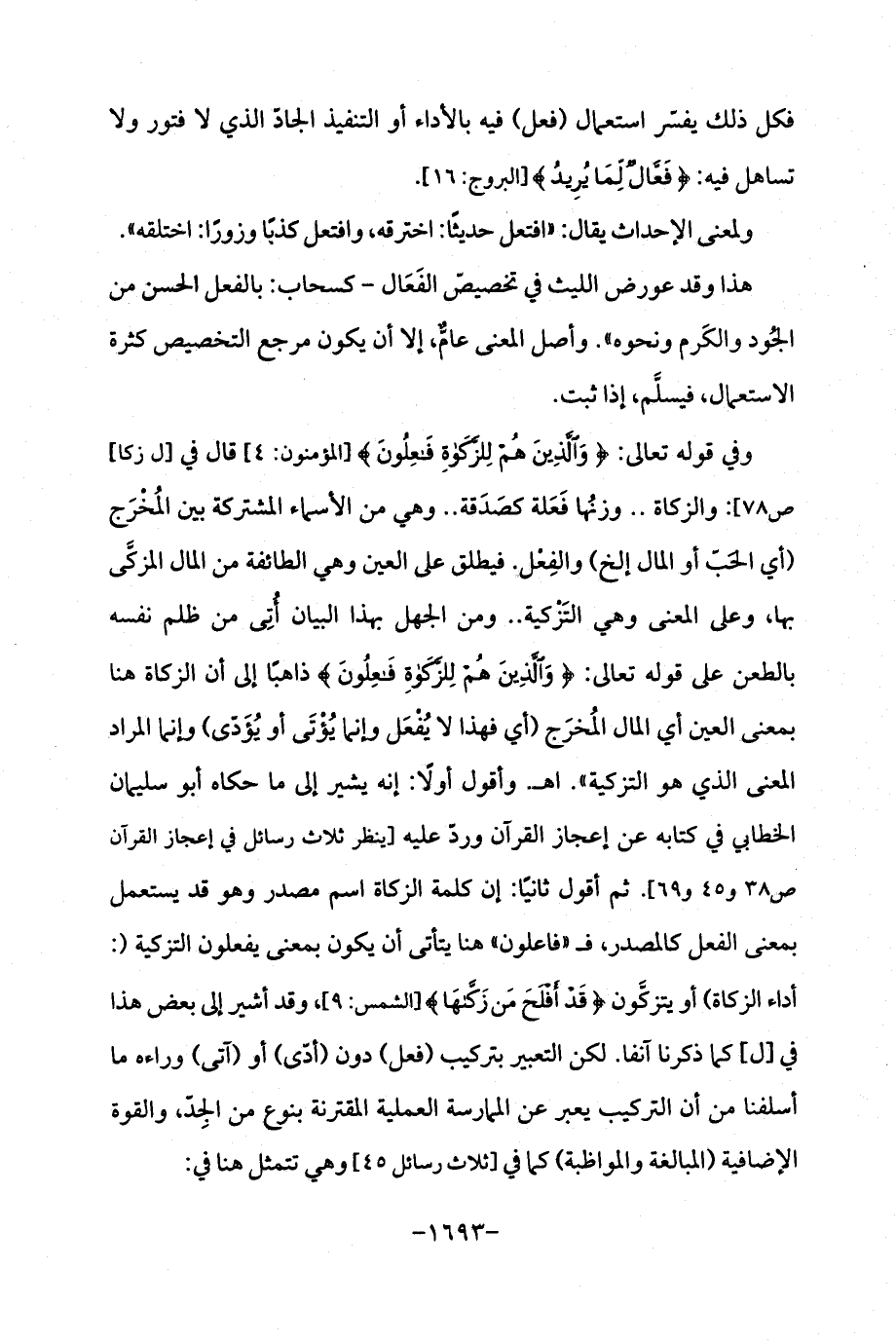 وفي قوله تعالى: {وَالَّذِينَ هُمْ لِلزَّكَاةِ فَاعِلُونَ} [المؤمنون: 4] قال في [ل زكا] ص 78]: والزكاة. . وزنُها فَعَلة كصَدَقة. . وهي من الأسماء المشتركة بين المُخْرَج (أي الحب أو المال إلخ) والفِعْل. فيطلق على العين وهي الطائفة من المال المزكَّى بها، وعلى المعنى وهي التَزْكية. . ومن الجهل بهذا البيان أُتِى من ظلم نفسه بالطعن على قوله تعالى: {وَالَّذِينَ هُمْ لِلزَّكَاةِ فَاعِلُونَ} ذاهبًا إلى أن الزكاة هنا بمعنى العين أي المال المُخرَج (أي فهذا لا يُفْعَل وإنما يُؤتَى أو يُؤَذى) وإنما المراد المعنى الذي هو التزكية ". اهـ. وأقول أولًا: إنه يشير إلى ما حكاه أبو سليمان الخطابي في كتابه عن إعجاز القرآن وردّ عليه [ينظر ثلاث رسائل في إعجاز القرآن ص 38 و 45 و 69]. ثم أقول ثانيًا: إن كلمة الزكاة اسم مصدر وهو قد يستعمل بمعنى الفعل كالمصدر، فـ "فاعلون "هنا يتأتى أن يكون بمعنى يفعلون التزكية (: أداء الزكاة) أو يتزكَّون {قَدْ أَفْلَحَ مَنْ زَكَّاهَا} [الشمس: 9]، وقد أشير إلى بعض هذا في [ل]. كما ذكرنا آنفا. لكن التعبير بتركيب (فعل) دون (أدّى) أو (آتى) وراءه ما أسلفنا من أن التركيب يعبر عن الممارسة العملية المقترنة بنوع من الجِدّ، والقوة الإضافيه (المبالغة والمواظبة) كما فى [ثلاث رسائل 45] وهي تتمثل هنا فى: