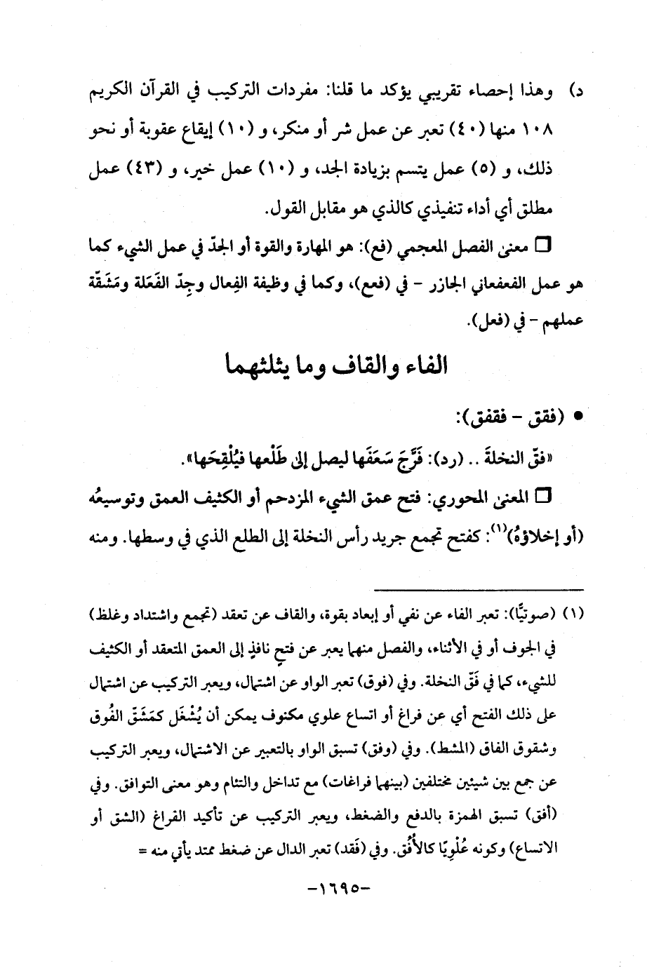 (¬1) (صوتيًّا): تعبر الفاء عن نفي أو إبعاد بقوة، والقاف عن تعقد (تجمع واشتداد وغلظ) في الجوف أو في الأثناء, والفصل منهما يعبر عن فتح نافذٍ إلى العمق المتعقد أو الكثيف للشيء، كما في فَقّ النخلة. وفي (فوق) تعبر الواو عن اشمال. ويعبر التركيب عن اشتمال على ذلك الفتح أي عن فراغ أو اتساع علوي مكنوف يمكن أن يُشْغَل كمَشَقّ الفُوق وشقوق الفاق (المشط). وفي (وفق) تسبق الواو بالتعبير عن الاشتمال. ويعبر التركيب عن جمع بين شيئين مختلفين (بينهما فراغات) مع تداخل والتئام وهو معنى التوافق. وفي (أفق) تسبق الهمزة بالدفع والضغط، ويعبر التركيب عن تأكيد الفراغ (الشق أو الاتساع) وكونه عُلْوِيًّا كالأُفُق. وفي (فقد) تعبر الدال عن ضغط ممتد يأتي منه =