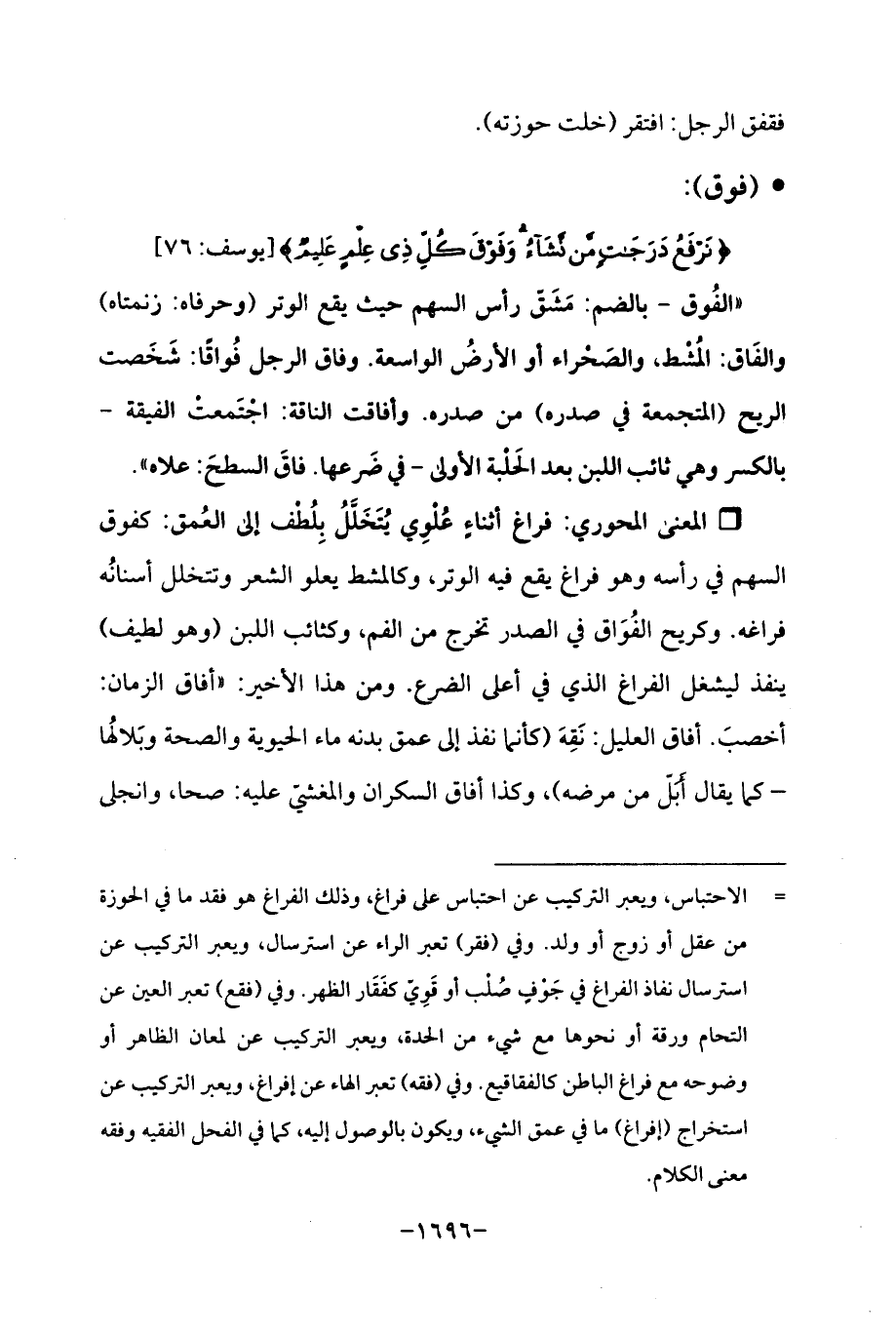 "الفُوق -بالضم: مَشَقّ رأس السهم حيث يقع الوتر (وحرفاه: زنمتاه) والفَاق: المُشْط، والصَحْراء أو الأرضُ الواسعة. وفاق الرجل فُواقًا: شَخَصت الريح (المتجمعة في صدره) من صدر. . وأفاقت الناقة: اجْتَمعتْ الفيقة -بالكسر وهي ثائب اللبن بعد الحَلْبة الأولى- في ضَرعها. فاقَ السطحَ: علاه ".