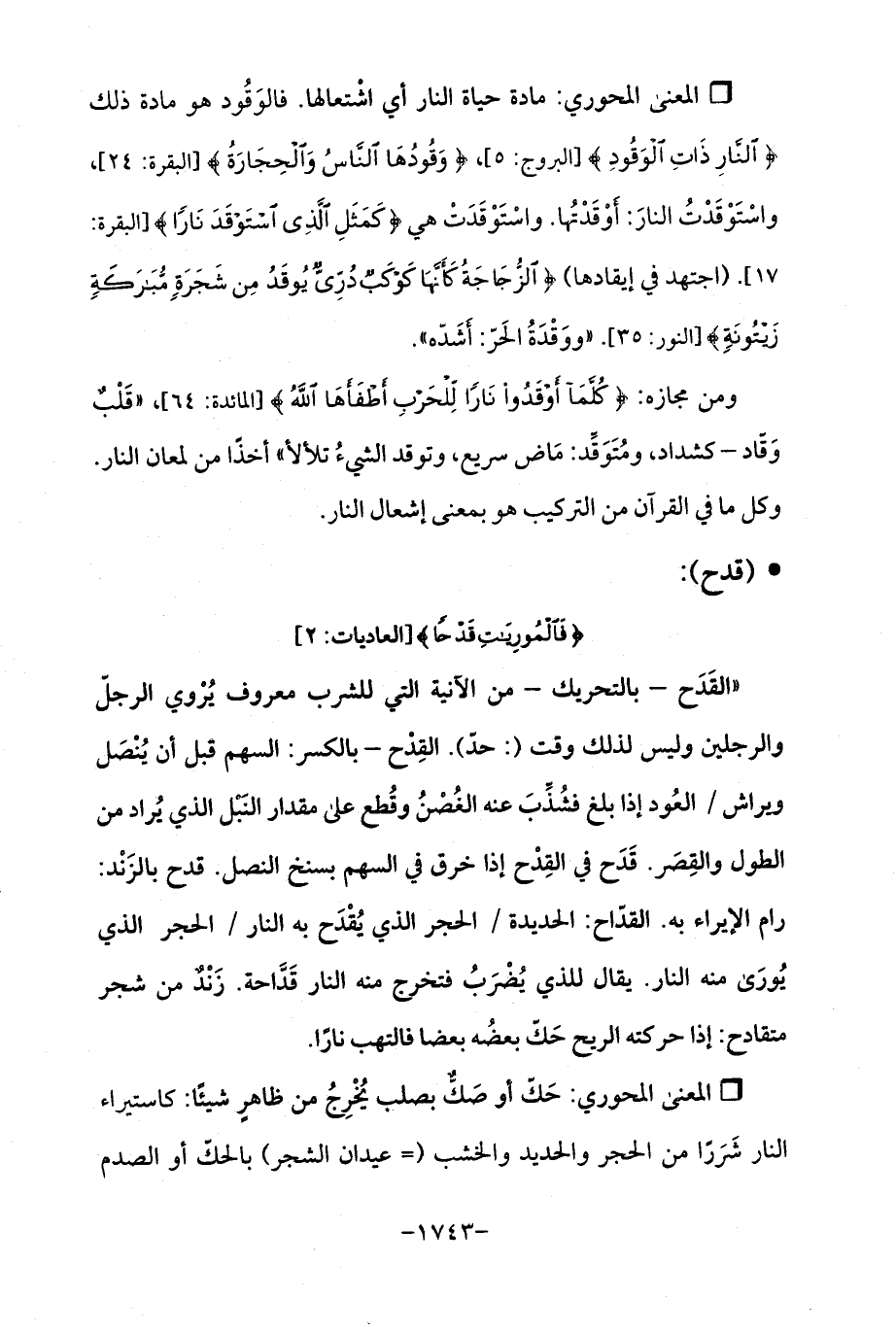 Qمادة حياة النار أي اشْتعالها. فالوَقُود هو مادة ذلك {النَّارِ ذَاتِ الْوَقُودِ} [البروج: 5]، {وَقُودُهَا النَّاسُ وَالْحِجَارَةُ} [البقرة: 24]، واسْتَوْقَدْتُ النارَ: أَوْقَدْتُها. واسْتَوْقَدَتْ هي {كَمَثَلِ الَّذِي اسْتَوْقَدَ نَارًا} [البقرة: 17]. (اجتهد في إيقادها) {الزُّجَاجَةُ كَأَنَّهَا كَوْكَبٌ دُرِّيٌّ يُوقَدُ مِنْ شَجَرَةٍ مُبَارَكَةٍ زَيْتُونَةٍ} [النور: 35]. "ووَقْدَةُ الحَرّ: أَشَدّه ".