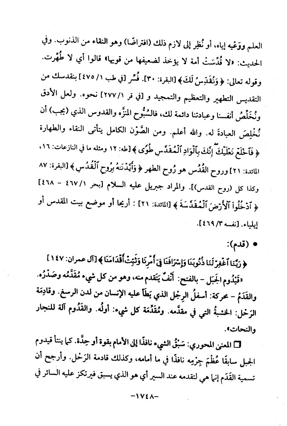 العلم ووَعْيه إياه، أو نُظِر إلى لازم ذلك (افتراضًا) وهو النقاء من الذنوب. وفي الحديث: "لا قُدِّسَت أمة لا يؤخذ لضعيفها من قويها "قالوا أي لا طُهِّرت. وقوله تعالى: {وَنُقَدِّسُ لَكَ} [البقرة: 30]. فُسِّر [في طب 1/ 475] بنقدسك من التقديس الظهير والتعظيم والتمجيد و [في قر 1/ 277] نحوه. ولعل الأدق ونُخَلِّصُ أنفسنا وعبادتنا دائمة لك، فالسُبُّوح المنزَّه والقدوس الذي (يجب) أن نُخْلِصَ العبادةَ له. والله أعلم. ومن الصَّوْن الكامل يتأتى النقاء والطهارة {فَاخْلَعْ نَعْلَيْكَ إِنَّكَ بِالْوَادِ الْمُقَدَّسِ طُوًى} [طه: 12 ومثله ما في النازعات: 16، المائدة: 21] وروح القُدُس هو رُوح الطهر {وَأَيَّدْنَاهُ بِرُوحِ الْقُدُسِ} [البقرة: 87 وكذا كل (روح القدس)]. والمراد جبريل عليه السلام [بحر 1/ 467 - 468] {ادْخُلُوا الْأَرْضَ الْمُقَدَّسَةَ} [المائدة: 21]: أريحا أو موضع بيت المقدس أو إيلياء. [نفسه 3/ 469].