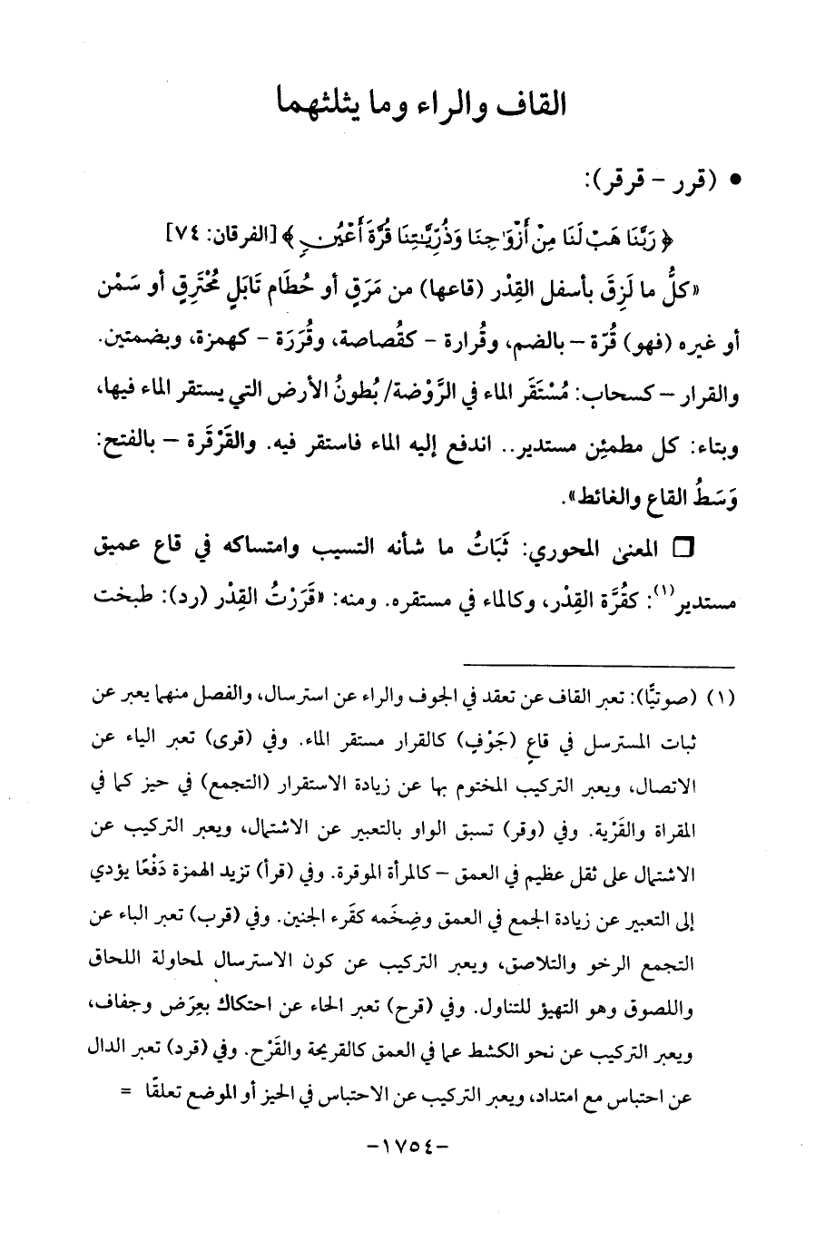 (¬1) (صوتيًّا): تعبر القاف عن تعقد في الجوف والراء عن استرسال، والفصل منهما يعبر عن ثبات المسترسل في قاعٍ (جَوْفٍ) كالقرار مستقر الماء. وفي (قرى) تعبر الياء عن الاتصال، ويعبر التركيب المختوم بها عن زيادة الاستقرار (التجمع) في حيز كما في المقراة والقَرْية. وفي (وقر) تسبق الواو بالتعبير عن الاشتمال، ويعبر التركيب عن الاشتمال على ثقل عظيم في العمق - كالمرأة الموقرة. وفي (قرأ) تزيد الهمزة دَفْعًا يؤدي إلى التعبير عن زيادة الجمع في العمق وضِخَمه كقَرء الجنين. وفي (قرب) تعبر الباء عن التجمع الرخو والتلاصق، ويعبر التركيب عن كون الاسترسال لمحاولة اللحاق واللصوق وهو التهيؤ للتناول. وفي (قرح) تعبر الحاء عن احتكاك بعِرَض وجفاف، ويعبر التركيب عن نحو الكشط عما في العمق كالقريحة والقَرْح. وفي (قرد) تعبر الدال عن احتباس مع امتداد، ويعبر التركيب عن الاحتباس في الحيز أو الموضع تعلقًا =
