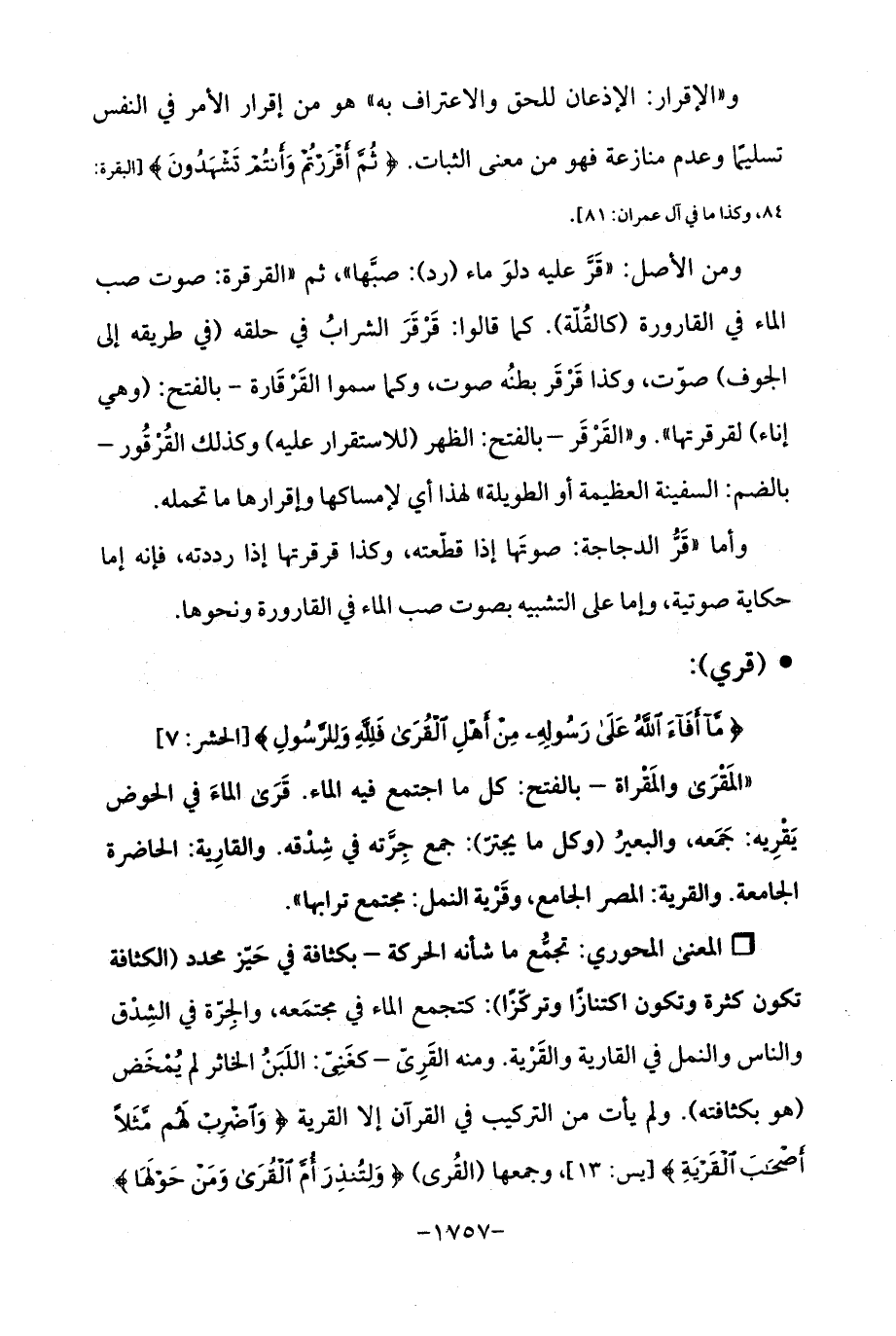 Qتجمُّع ما شأنه الحركة - بكثافة في حَيّز محدد (الكثافة تكون كثرة وتكون اكتنازًا وتركّزًا): كتجمع الماء في مجتمَعه، والجِرّة في الشِدْق والناس والنمل في القارية والقَرْية. ومنه القَرِىّ - كغَنِيّ: اللَبَنُ الخاثر لم يُمْخَض (هو بكثافته). ولم يأت من التركيب في القرآن إلا القرية {وَاضْرِبْ لَهُمْ مَثَلًا أَصْحَابَ الْقَرْيَةِ} [يس: 13]، وجمعها (القُرى) {وَلِتُنْذِرَ أُمَّ الْقُرَى وَمَنْ حَوْلَهَا}