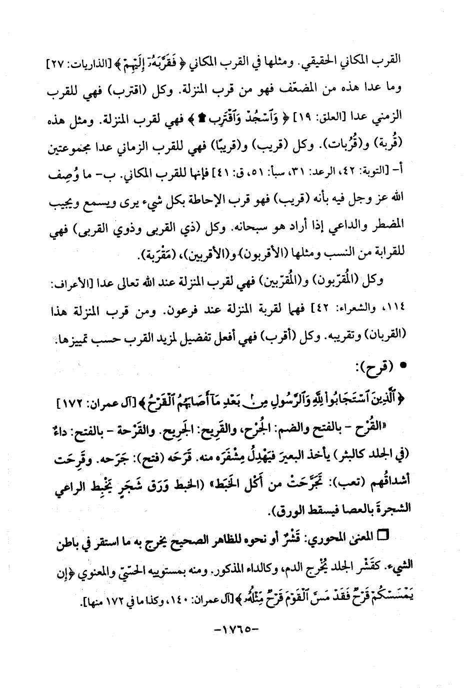 القرب المكاني الحقيقي. ومثلها في القرب المكاني {فَقَرَّبَهُ إِلَيْهِمْ} [الذاريات: 27] وما عدا هذه من المضعَّف فهو من قرب المنزلة. وكل (اقترب) فهي للقرب الزمني عدا [العلق: 19] {وَاسْجُدْ وَاقْتَرِبْ} فهي لقرب المنزلة. ومثل هذه (قُربة) و (قُرُبات). وكل (قريب) و (قريبًا) فهي للقرب الزماني عدا مجموعتين أ -[التوبة: 42، الرعد: 31، سبأ: 51، ق: 41] فإنها للقرب المكاني. ب - ما وُصِف الله عز وجل فيه بأنه (قريب) فهو قرب الإحاطة بكلل شيء يرى ويسمع ويجيب المضطر والداعي إذا أراد هو سبحانه. وكل (ذي القربى وذوي القربى) فهي للقرابة من النسب ومثلها (الأقربون). و (الأقربين)، (مَقْرَبة).