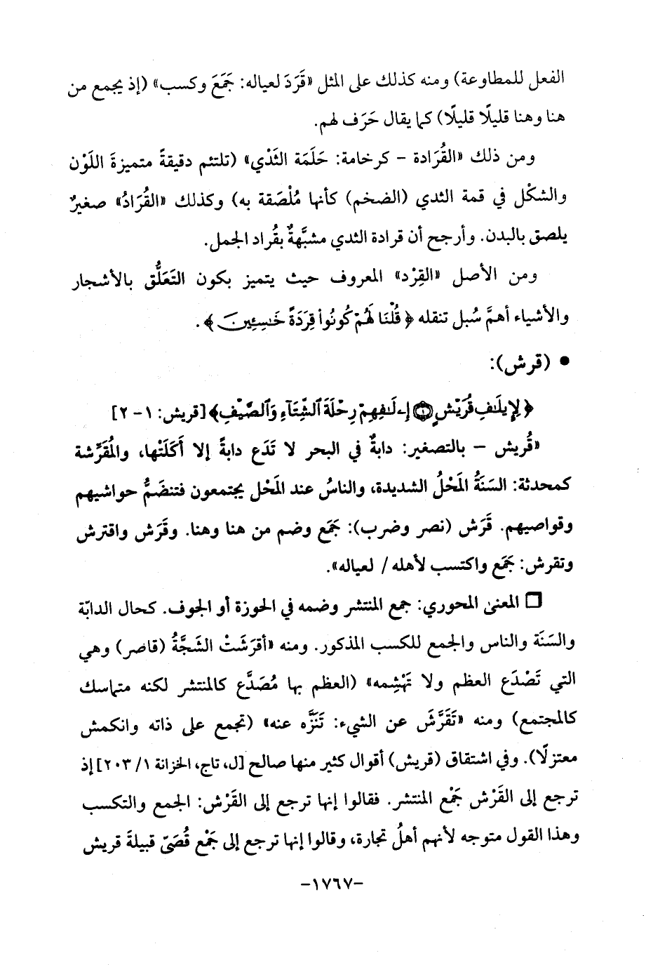 "قُريش - بالتصغير: دابةٌ في البحر لا تَدَع دابةً إلا أَكَلَتْها، والمُقَرِّشة كمحدثة: السَنَةُ المَحْلُ الشديدة، والناسُ عند المَحْل يجتمعون فتنضَمُّ حواشيهم وقواصيهم. قَرَش (نصر وضرب): جَمَع وضم من هنا وهنا. وقَرَش واقترش وتقرش: جَمَع واكتسب لأهله/ لعياله ".