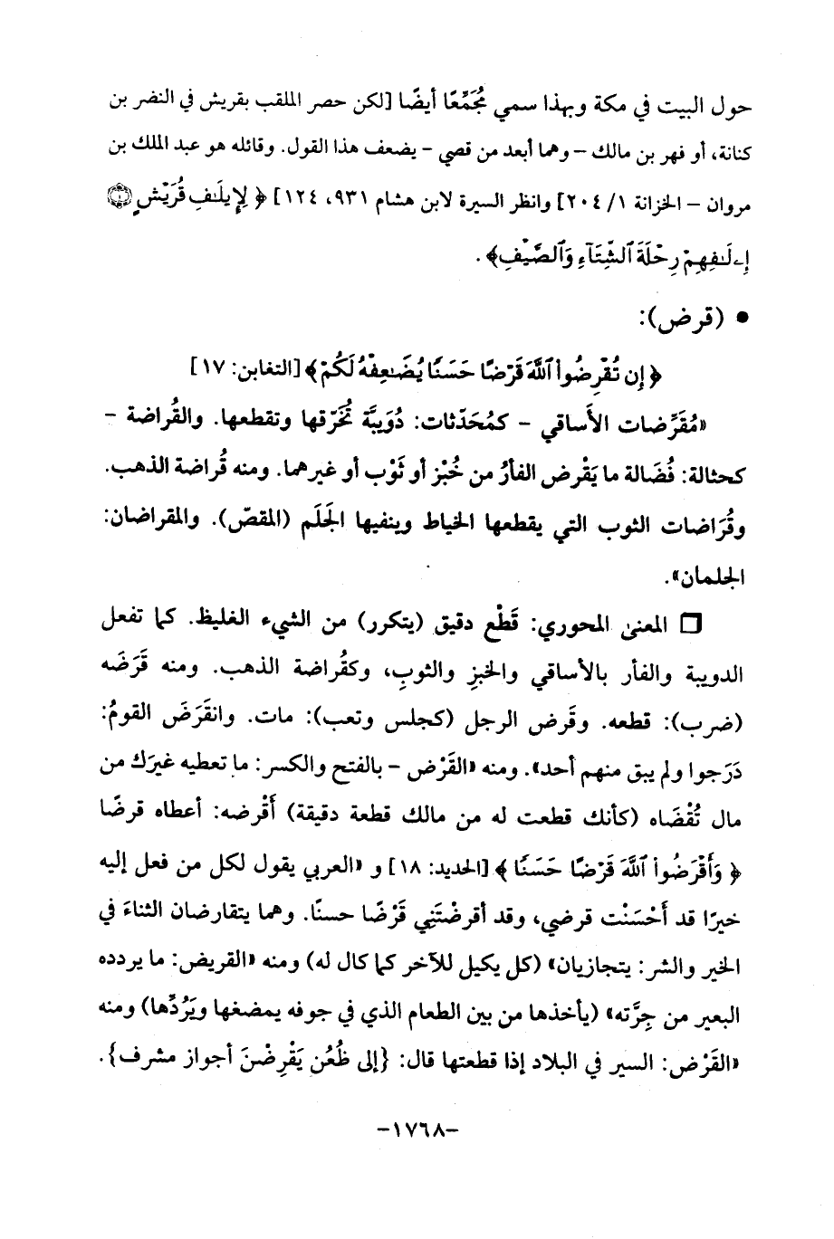 Qقَطْع دقيق (يتكرر) من الشيء الغليظ. كما تفعل الدويبة والفأر بالأساقي والخبزِ والثوبِ، وكقُراضة الذهب. ومنه قَرَضَه (ضرب): قطعه. وقَرض الرجل (كجلس وتعب): مات. وانقَرَضَ القومُ: دَرَجوا ولم يبق منهم أحد ". ومنه "القَرْض - بالفتح والكسر: ما تعطيه غيرَك من مال تُقضَاه (كأنك قطعت له من مالك قطعة دقيقة) أَقْرضه: أعطاه قرضًا {وَأَقْرَضُوا اللَّهَ قَرْضًا حَسَنًا} [الحديد: 18] و "العربي يقول لكل من فعل إليه خيرًا قد أَحْسَنْت قرضي، وقد أقرضْتَنِي قَرْضًا حسنًا. وما يتقارضان الثناءَ في الخير والشر: يتجازيان " (كل يكيل للآخر كما كال له) ومنه "القريض: ما يردده البعير من جِرَّته " (يأخذها من بين الطعام الذي في جوفه يمضغها وَيرُدّها) ومنه "القَرْض: السير في البلاد إذا قطعتها قال: (إلى ظُعُن يَقْرِضْنَ أجواز مشرف).