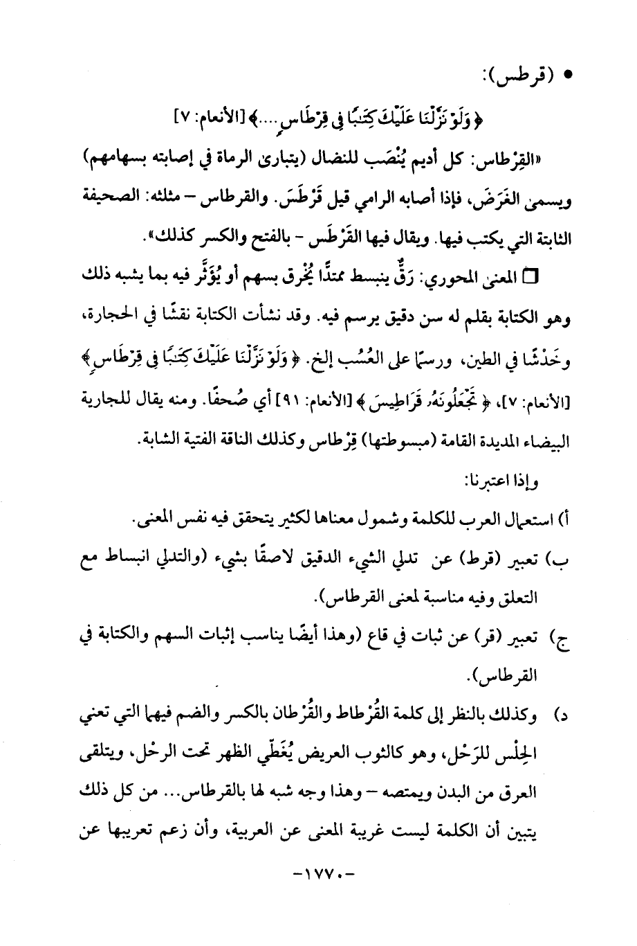د) وكذلك بالنظر إلى كلمة القُرْطاط والقُرْطان بالكسر والضم فيهما التي تعني الحِلْس للرَحْل، وهو كالثوب العريض يُغَطّي الظهر تحت الرحْل، ويتلقى العرق من البدن ويمتصه - وهذا وجه شبه لها بالقرطاس ... من كل ذلك يتبين أن الكلمة ليست غريبة المعنى عن العربية، وأن زعم تعريبها عن