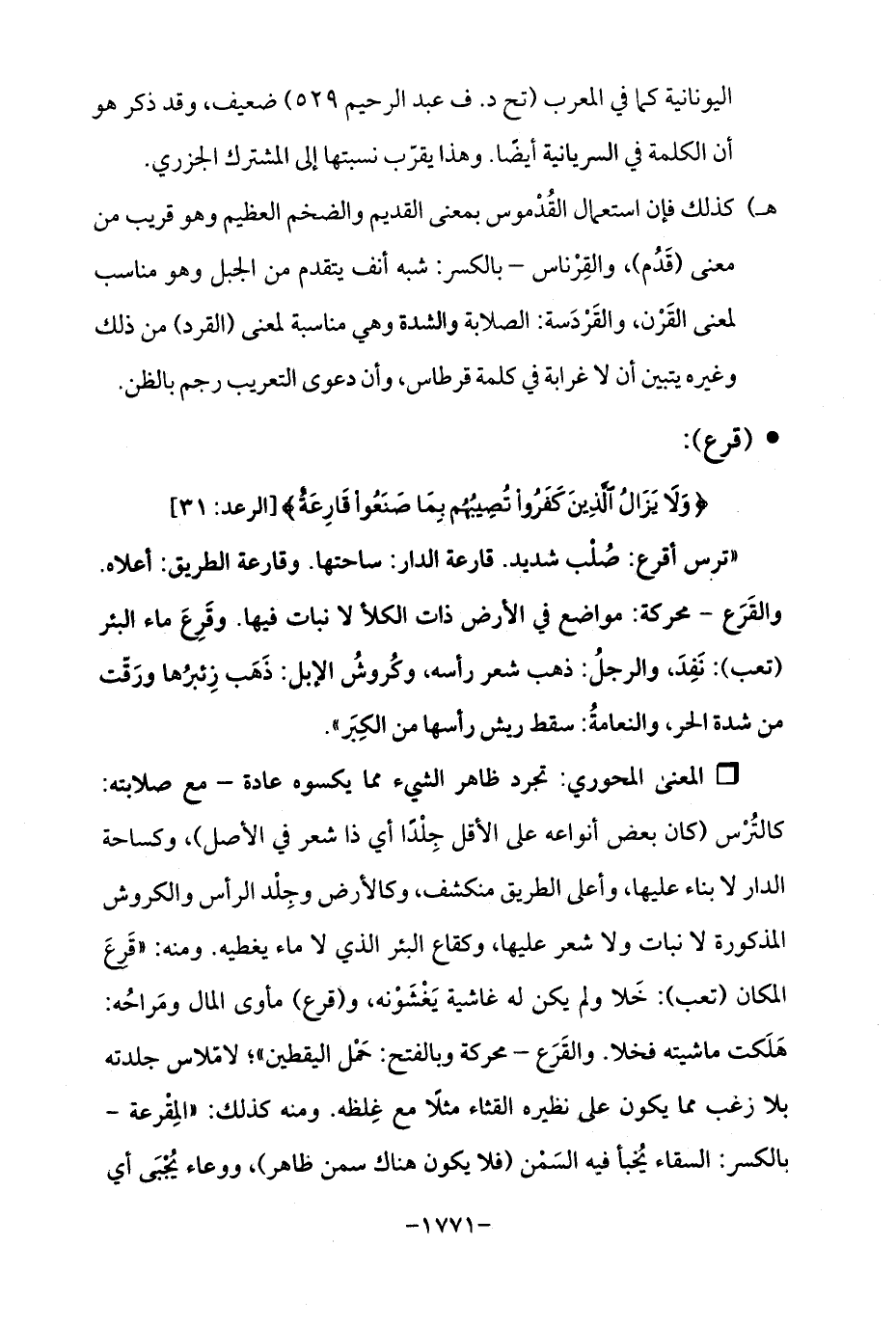 هـ) كذلك فإن استعمال القُدْموس بمعنى القديم والضخم العظيم وهو قريب من معنى (قَدُم)، والقِرْناس - بالكسر: شبه أنف يتقدم من الجبل وهو مناسب لمعنى القَرْن، والقَرْدَسة: الصلابة والشدة وهي مناسبة لمعنى (القرد) من ذلك وغيره يتبين أن لا غرابة في كلمة قرطاس، وأن دعوى التعريب رجم بالظن.