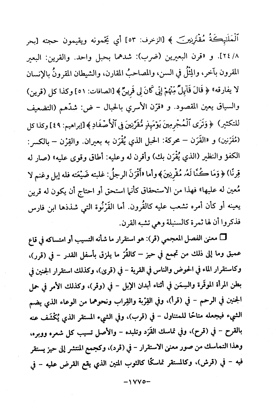 الْمَلَائِكَةُ مُقْتَرِنِينَ} [الزخرف: 53] أي يَحْمونه ويقيمون حجته [بحر 8/ 24]. و "قرن البعيرين (ضرب): شدهما بحبل واحد. والقرين: البعير المقرون بآخر، والمِثْلُ في السن، والمصاحبُ المقارن، والشيطان المقرونُ بالإنسان لا يفارقه " {قَالَ قَائِلٌ مِنْهُمْ إِنِّي كَانَ لِي قَرِينٌ} [الصافات: 51] وكذا كل (قرين) والسياق يعين المقصود. و "قرّن الأسرى بالحبال - ض: شدّهم (التضعيف للتكثير) {وَتَرَى الْمُجْرِمِينَ يَوْمَئِذٍ مُقَرَّنِينَ فِي الْأَصْفَادِ} [إبراهيم: 49] وكذا كل (مُقَرّنين) و "القَرَن - محركة: الحبل الذي يُقْرَن به بعيران. والقِرْن - بالكسر: الكفؤ والنظير (الذي يُقْرَن بك) وأقرن له وعليه: أطاق وقوى عليه " (صار له قِرنًا) {وَمَا كُنَّا لَهُ مُقْرِنِينَ} وأما "أَقْرَنَ الرجلُ: غلبته ضَيْعَته فله إبل وغنم لا مُعين له عليها "فهذا من الاستحقاق كأنما استحق أو احتاج أن يكون له قرين يعينه أو كأن أمره تشعب عليه كالقُرون. أما القَرْنُوة التي شذذها ابن فارس فذكروا أن لها ثمرة كالسنبلة وهي تشبه القرن.