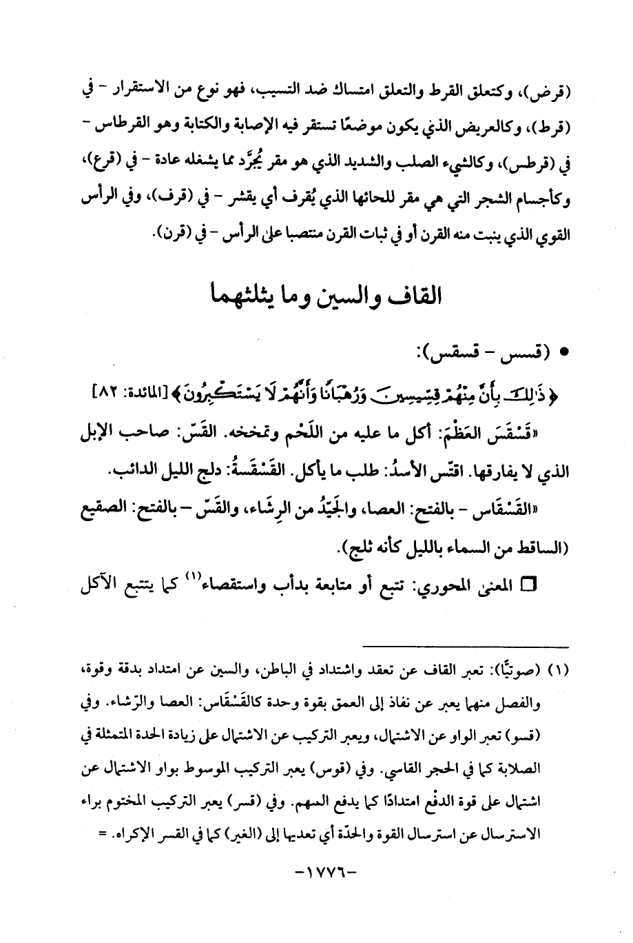 (¬1) (صوتيًّا): تعبر القاف عن تعقد واشتداد في الباطن، والسين عن امتداد بدقة وقوة، والفصل منهما يعبر عن نفاذ إلى العمق بقوة وحدة كالقَسْقَاس: العصا والرّشاء. وفي (قسو) تعبر الواو عن الاشتمال، ويعبر التركيب عن الاشتمال عل زيادة الحدة المتمثلة في الصلابة كما في الحجر القاسي. وفي (قوس) يعبر التركيب الموسوط بواو الاشتمال عن اشتمال عل قوة الدفْع امتدادًا كما يدفع السهم. وفي (قسر) يعبر التركيب المختوم براء الاسترسال عن استرسال القوة والحدّة أي تعديها إلى (الغير) كما في القسر الإكراه. =