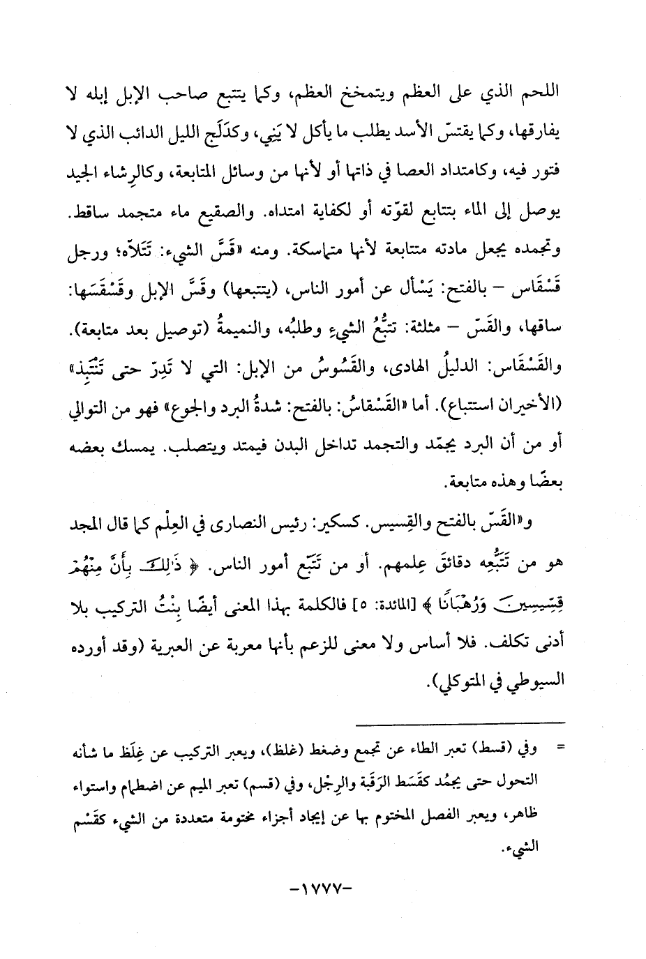 و"القَسّ بالفتح والقِسيس. كسكير: رئيس النصارى في العِلْم كما قال المجد هو من تَتَبُّعِه دقائقَ عِلمهم. أو من تَتبّع أمور الناس. {ذَلِكَ بِأَنَّ مِنْهُمْ قِسِّيسِينَ وَرُهْبَانًا} [المائدة: 82] فالكلمة بهذا المعنى أيضًا بِنْتُ التركيب بلا أدنى تكلف. فلا أساس ولا معنى للزعم بأنها معربة عن العبرية (وقد أورده السيوطي في المتوكلي).