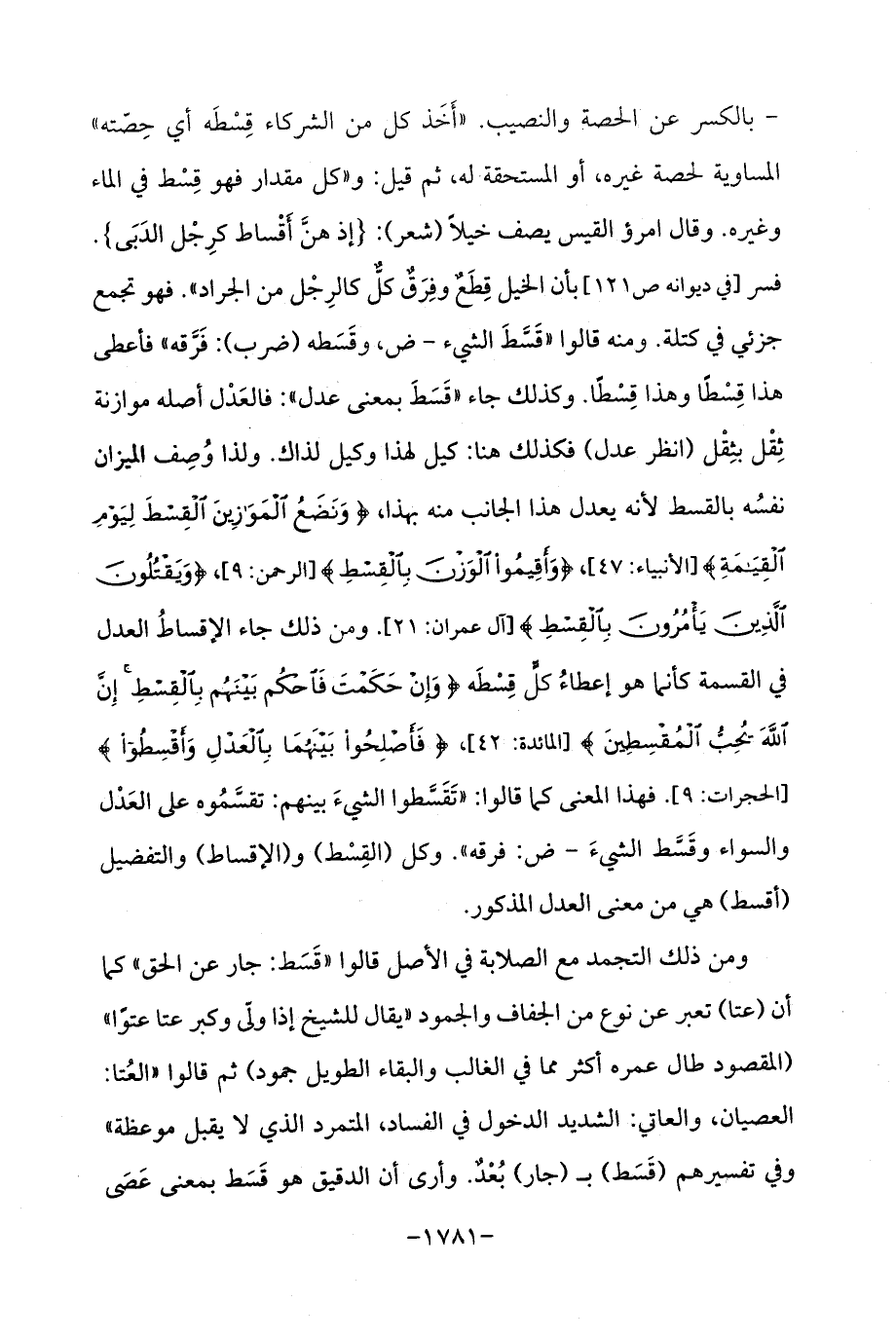 - بالكسر عن الحصة والنصيب. "أَخَذ كل من الشركاء قِسْطَه أي حِصّته "المساوية لحصة غيره، أو المستحقة له، ثم قيل: و "كل مقدار فهو قِسْط في الماء وغيره. وقال امرؤ القيس يصف خيلًا (شعر): (إذ هنَّ أَقْساط كرِجْل الدَبَى). فسر [في ديوانه ص 121] بأن الخيل قِطَعٌ وفِرَقٌ كلٌّ كالرِجْل من الجراد ". فهو تجمع جزئي في كتلة. ومنه قالوا "قَسَّطَ الشيء - ض، وقَسَطه (ضرب): فَرَّقه "فأعطى هذا قِسْطًا وهذا قِسْطًا. وكذلك جاء "قَسَطَ بمعنى عدل ": فالعَدْل أصله موازنة ثِقْل بثِقْل (انظر عدل) فكذلك هنا: كيل لهذا وكيل لذاك. ولذا وُصِف الميزان نفسُه بالقسط لأنه يعدل هذا الجانب منه بهذا، {وَنَضَعُ الْمَوَازِينَ الْقِسْطَ لِيَوْمِ الْقِيَامَةِ} [الأنبياء: 47]، {وَأَقِيمُوا الْوَزْنَ بِالْقِسْطِ} [الرحمن: 9]، {وَيَقْتُلُونَ الَّذِينَ يَأْمُرُونَ بِالْقِسْطِ} [آل عمران: 21]. ومن ذلك جاء الإقساطُ العدل في القسمة كأنما هو إعطاءُ كلٍّ قِسْطَه {وَإِنْ حَكَمْتَ فَاحْكُمْ بَيْنَهُمْ بِالْقِسْطِ إِنَّ اللَّهَ يُحِبُّ الْمُقْسِطِينَ} [المائدة: 42]، {فَأَصْلِحُوا بَيْنَهُمَا بِالْعَدْلِ وَأَقْسِطُوا} [الحجرات: 9]. فهذا المعنى كما قالوا: "تَقَسَّطوا الشيءَ بينهم: تقسَّمُوه على العَدْل والسواء وقَسَّط الشيءَ - ض: فرقه ". وكل (القِسْط) و (الإقساط) والتفضيل (أقسط) هي من معنى العدل المذكور.